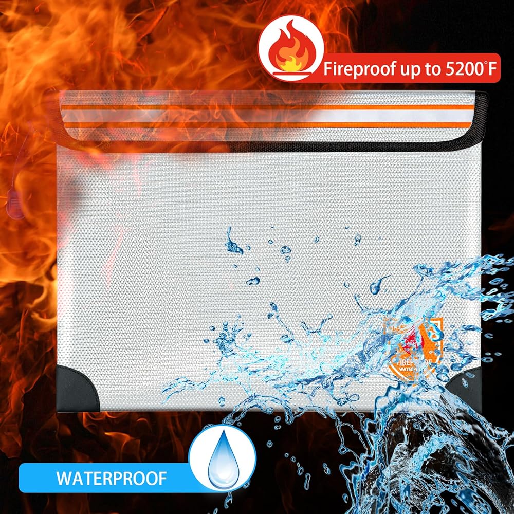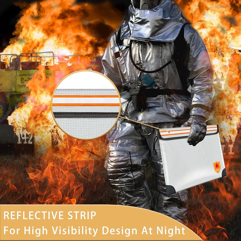 مقاومة للحريق والماء بنسبة 100%: حقيبتنا المقاومة للحريق والماء مصنوعة من ثلاث طبقات من الألياف الزجاجية المطلية بالسيليكون عالية الجودة وغير المسببة للحكة، وقادرة على تحمل درجات حرارة تصل إلى 2200 درجة فهرنهايت (بشكل عام، درجة حرارة الحريق ليست أعلى من 2000 درجة فهرنهايت) !). تتميز الحقيبة بسحاب احترافي مقاوم للماء، وإغلاق بإبزيم من النايلون، ومعالجة صارمة مقاومة للماء عند طبقات الحافة لتحمل رذاذ خرطوم الحريق عالي السرعة ومنع الحريق والحرارة والدخان من دخول الحقيبة.