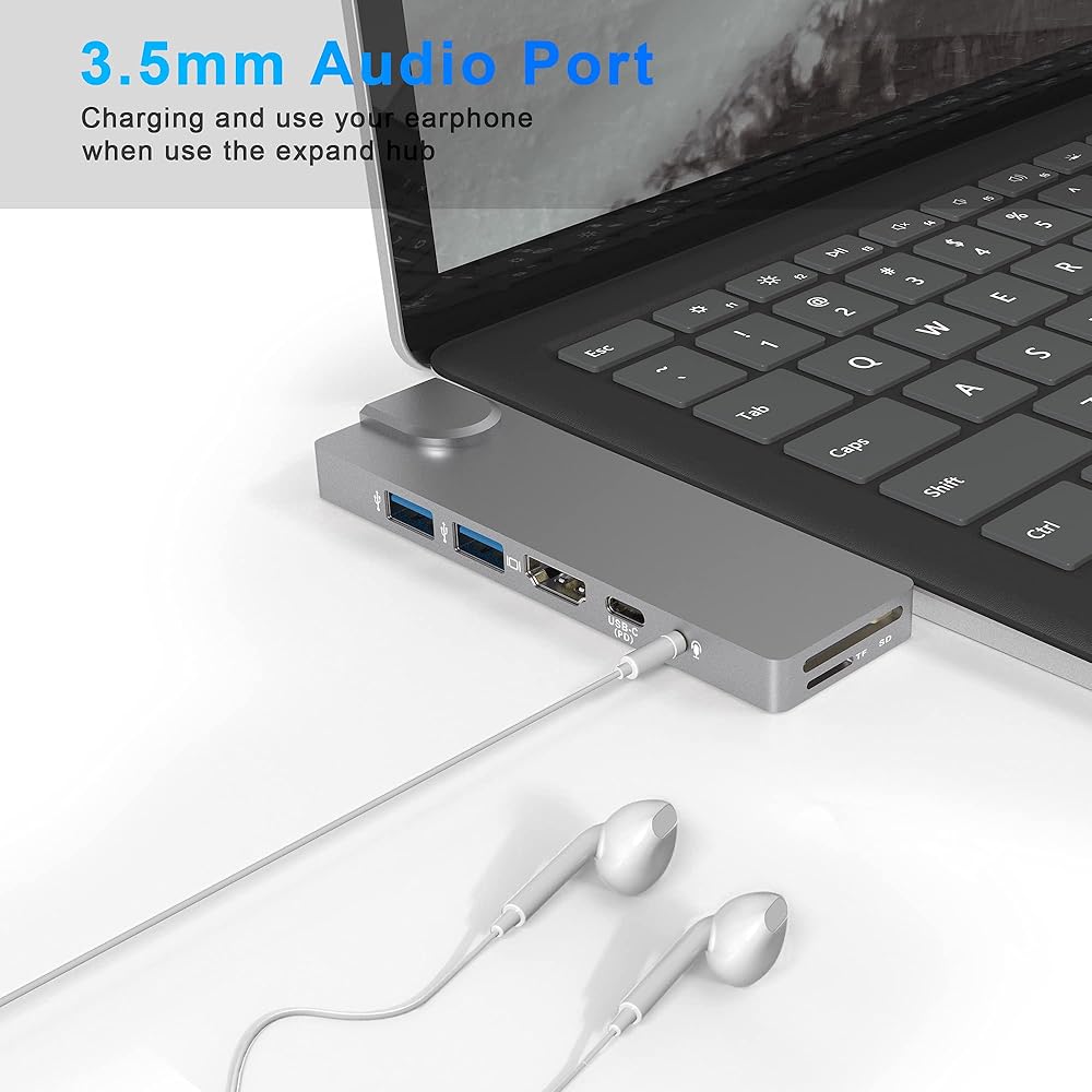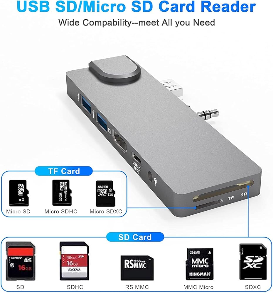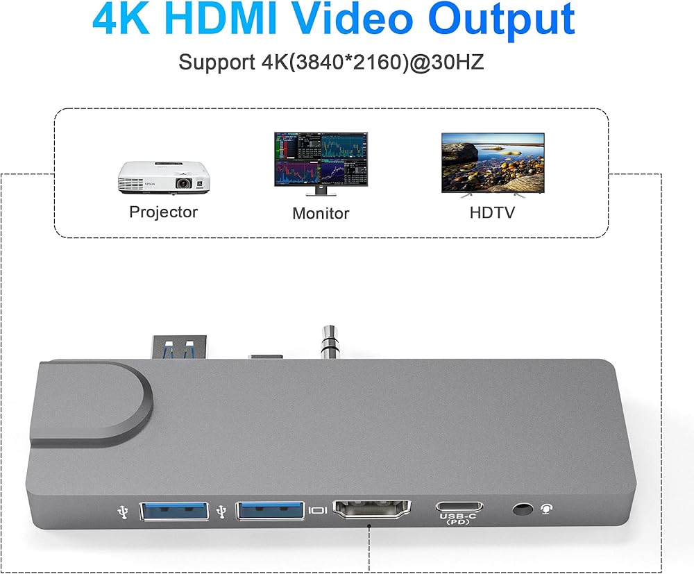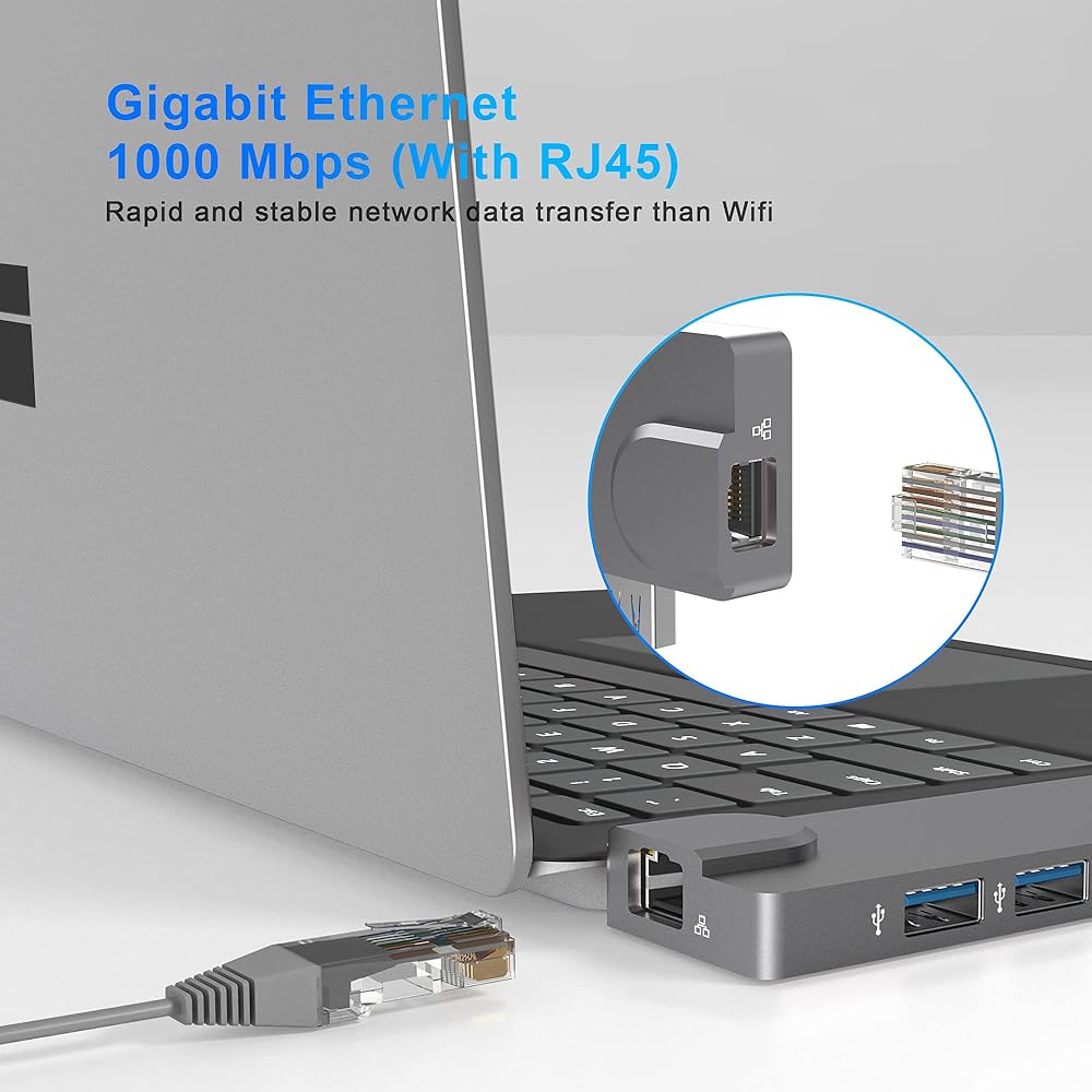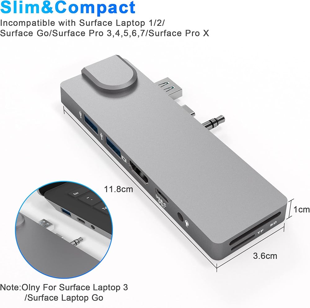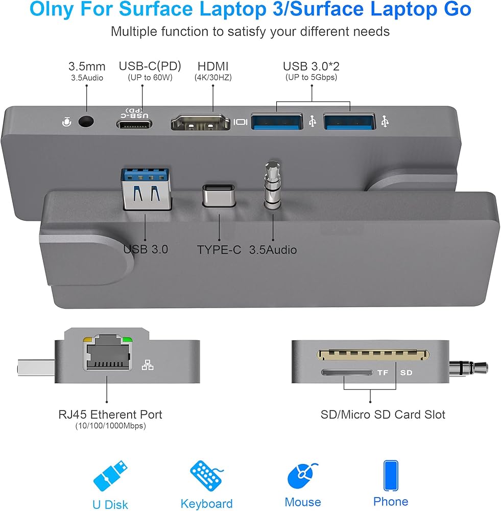 Surface Laptop 3/Laptop Go Hub with 4K HDMI, RJ45 Gigabit Ethernet,60W Type-C Charging Port,2X USB 3.0 Ports,USB3.0 SD&TF Card Reader adapter,3.5mm Audio Port.Surface Laptop Dock is only design for Surface laptop 3/Go,with has aluminum alloy surface, compact and beautiful shape.