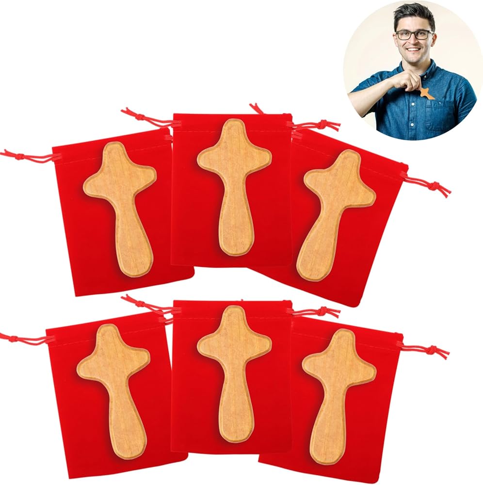 6 مجموعات صغيرة محمولة باليد من خشب الصنوبر مع حقيبة مخملية جيب صليب 4.1 بوصة محمولة تحمل جيب خشبي صليب ملتصق صليب يسوع هدية للصلاة بحجم راحة اليد للرجال هدية الكنيسة (بني فاتح)