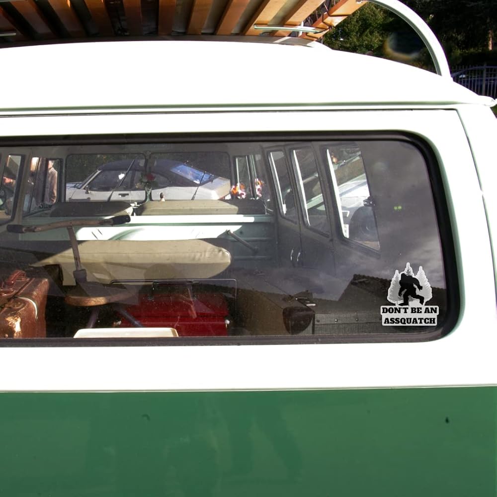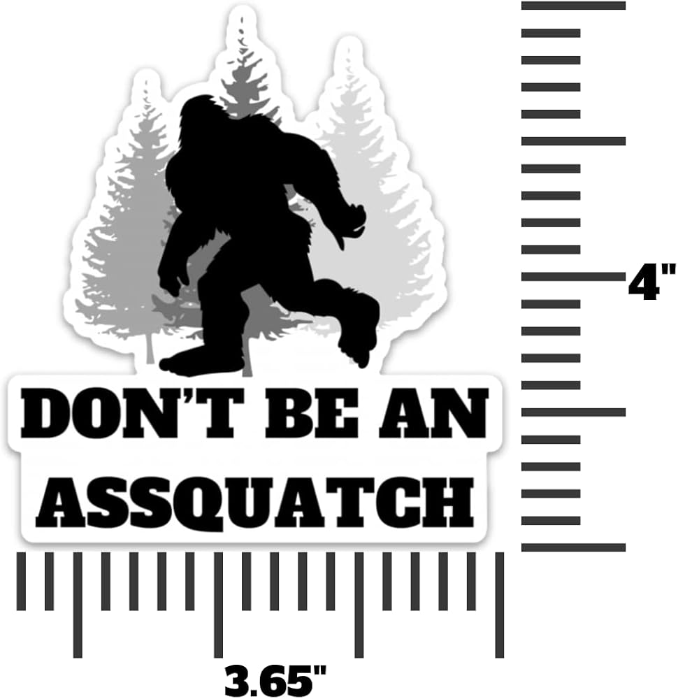 Don't be an Assquatch Sasquatch Bigfoot Vinyl Sticker Decal for Car, Truck, SUV, Van, Bumper, or Water Bottle - 4 Inches. These fun stickers are made with durable weatherproof vinyl, holds up rain or shine. It makes for a great Bigfoot gift, for occasions like, birthdays, fathers day, mothers day, or any holiday gift.