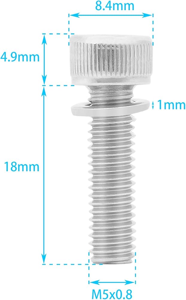 - ✔️ الأبعاد - 【مسمار】ارتفاع الرأس 4.9 مم / قطر الرأس 8.4 مم / 4 مم سداسي / خيط M5-0.8 / طول الخيط 18 مم 【غسالة: القطر الخارجي 8 مم / القطر الداخلي 5.1 مم / سمك 1 مم