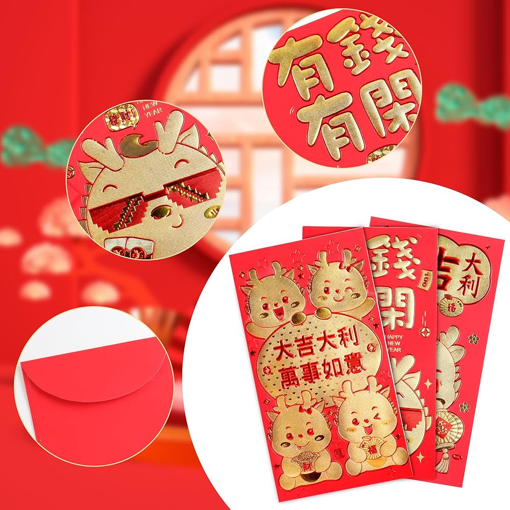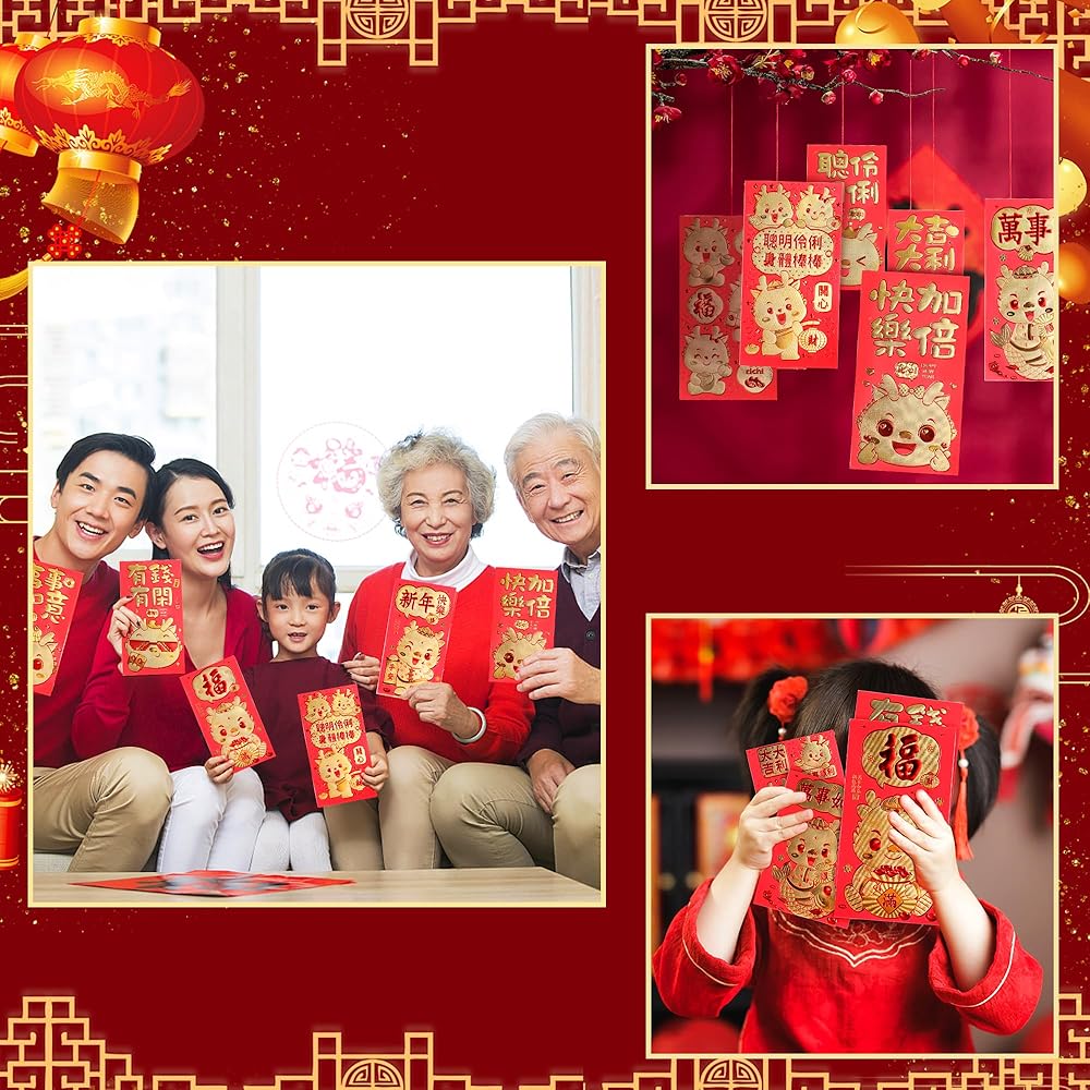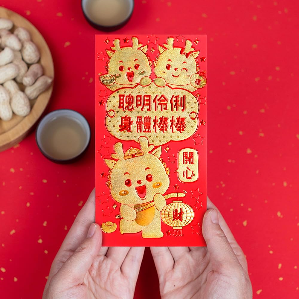 Each Chinese red envelope features lucky red and festive gold color with blessing words that will bring blessings, good luck, health, and wealth to the person who receives or gives them.