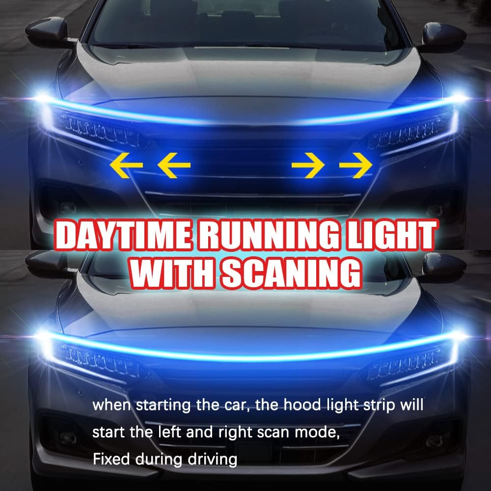 شريط إضاءة LED لغطاء السيارة، طقم شعاع بدء المسح الديناميكي الخارجي مقاس 59 بوصة لمصابيح الغلاف الجوي المزخرفة لمحرك السيارة، تشغيل السيارات العالمية أثناء النهار لسيارات الدفع الرباعي والشاحنات (59 بوصة، أزرق)