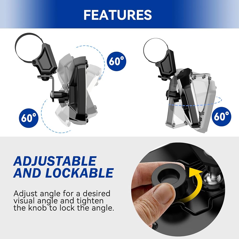 قابلية التعديل: تصميم مفصل الكرة 360 درجة يجعل من السهل ضبط زاوية مرآة الرؤية الخلفية التي تحتاجها. يوجد مقبض في الجزء الخلفي من مرآة الرؤية الخلفية، مما يسمح لك بقفل زاوية المرآة لمنع المرآة من الاهتزاز والصدمات بشكل فعال أثناء القيادة على الطرق الوعرة أو السباق.