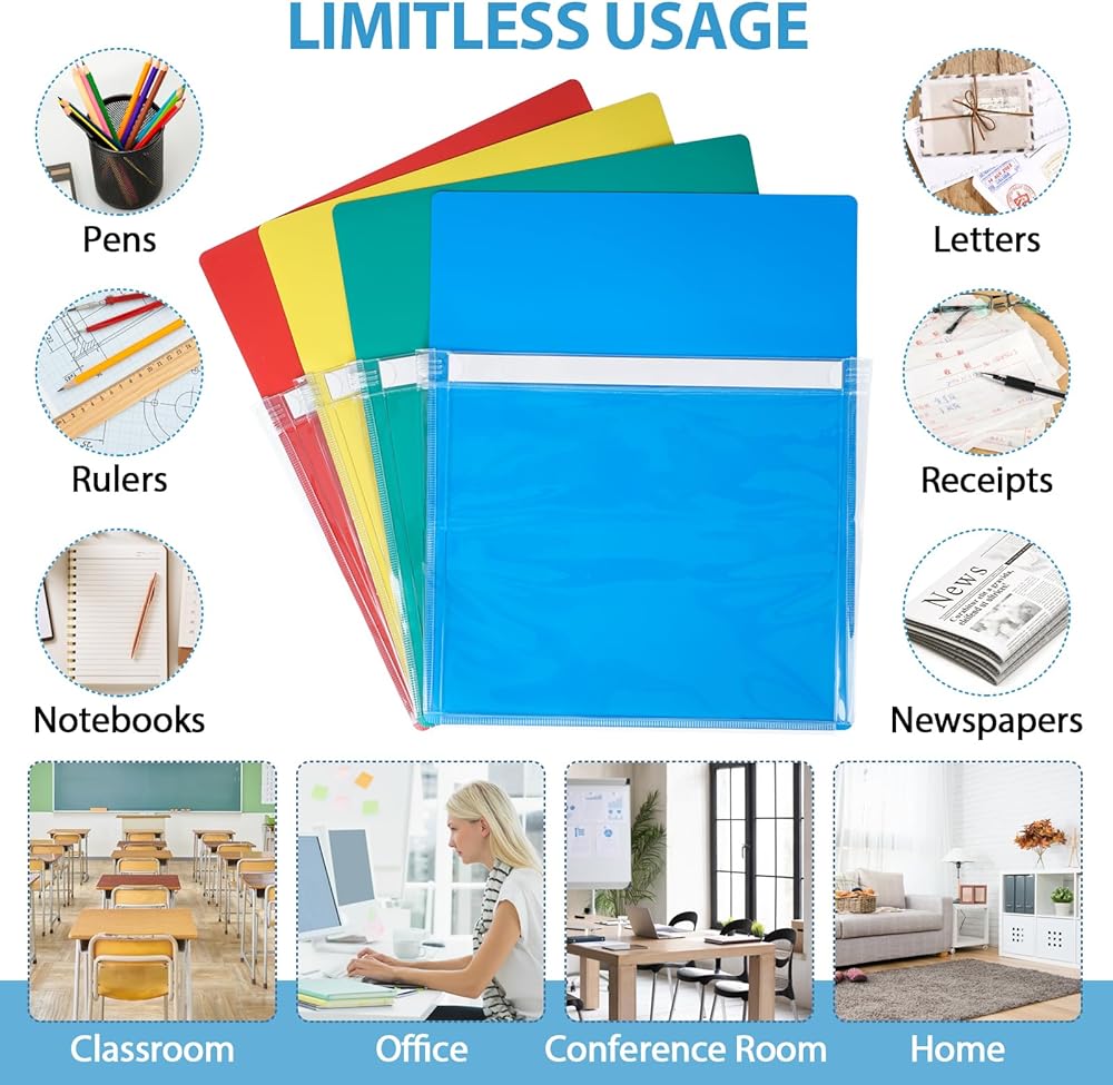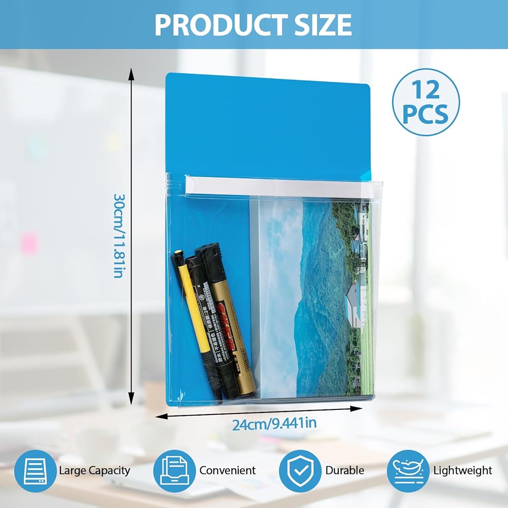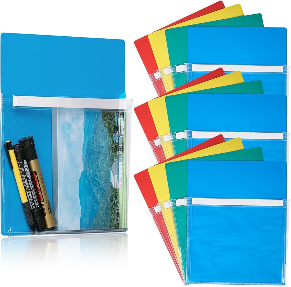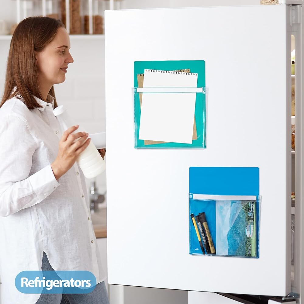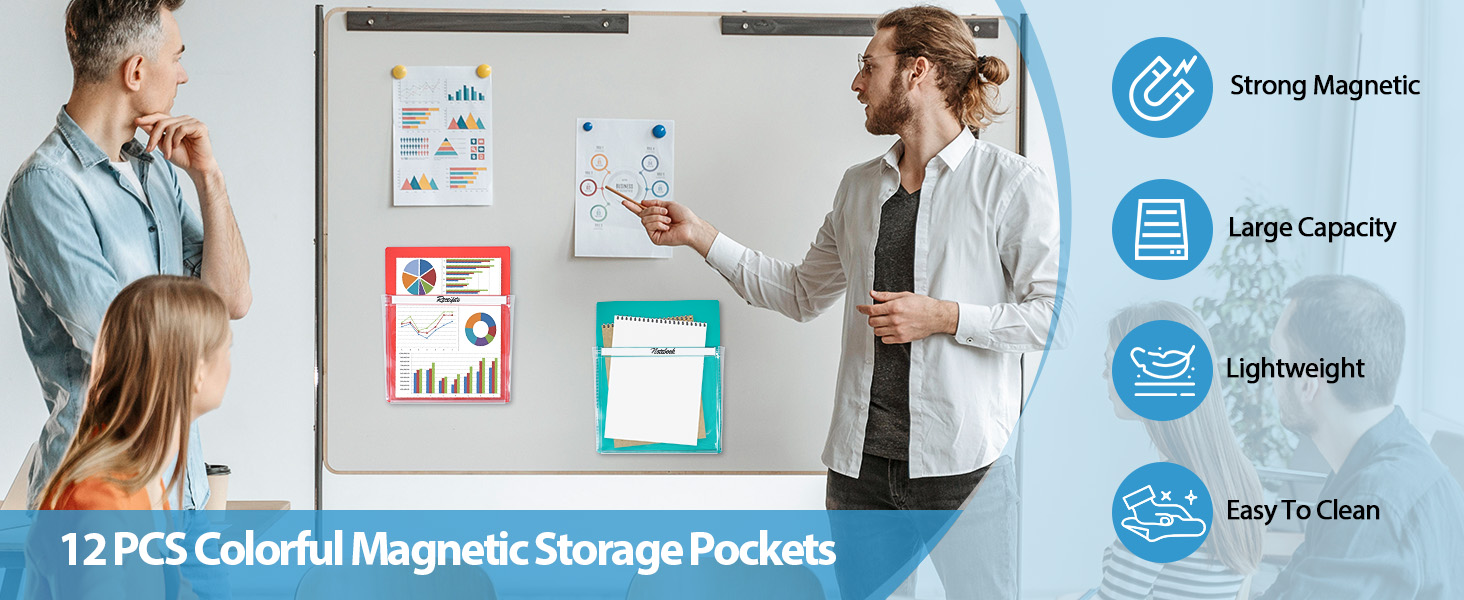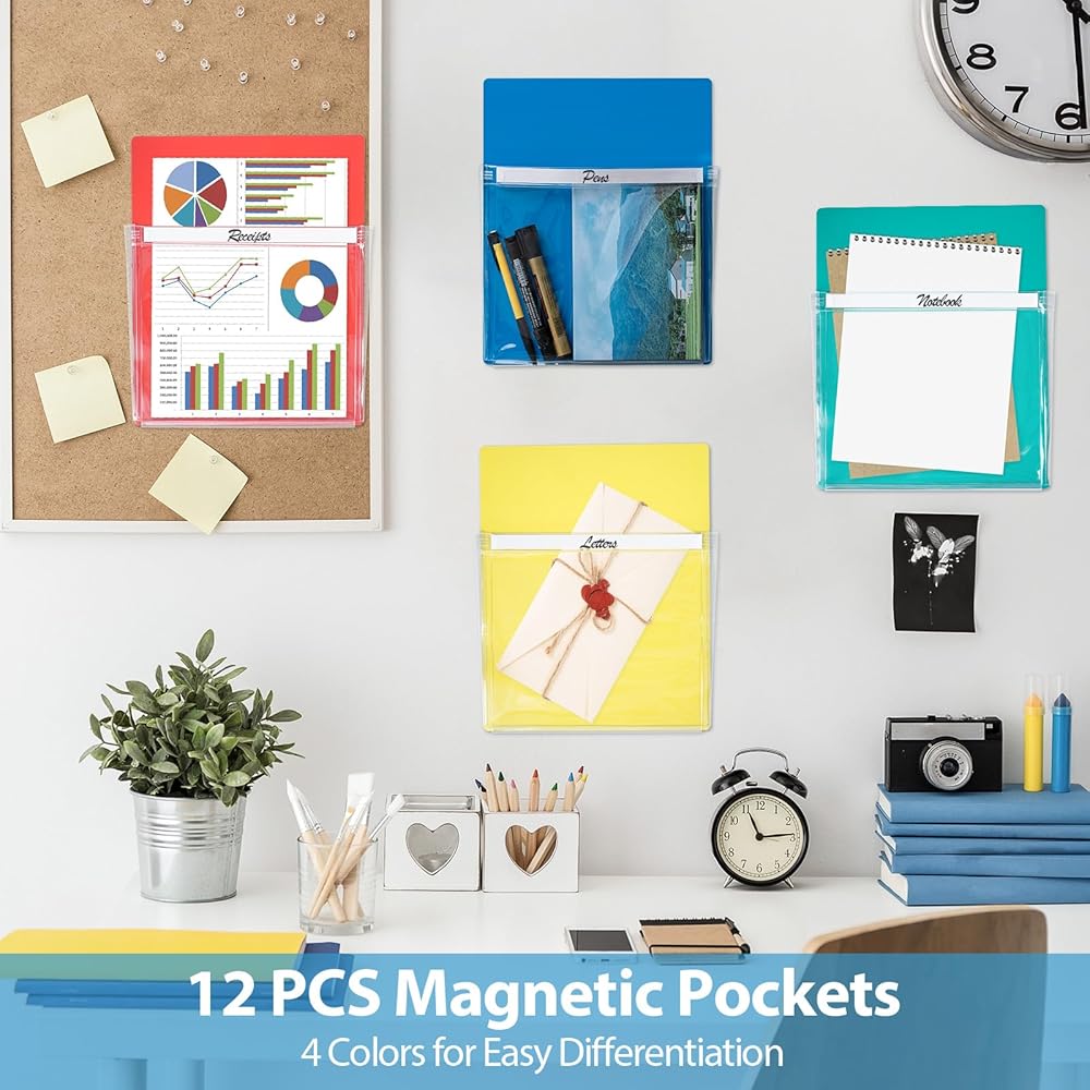 【العبوة متضمنة】سوف تحصل على 12 قطعة من الجيوب المغناطيسية، 4 قطع من كل لون أحمر، أصفر، أزرق وأخضر، كمية كافية وتصميم ألوان مميز يمكن أن يلبي احتياجاتك اليومية من الاستخدام والاستبدال، يمكنك وضع مستندات مختلفة في جيوب ملفات بألوان مختلفة، سهلة الاستخدام تنظيم وترتيب حياتك.