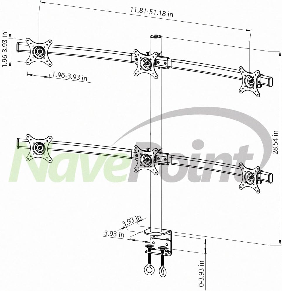This ergonomic LCD Monitor mount makes is easy to use multiple monitors at the same time. Improve your productivity with this stand by managing multiple programs/spreadsheets simultaneously. The sturdy construction is designed to offer users the ability to reposition their monitors for maximum comfort and optimum viewability. A perfect solution for limited space applications. Mounts easily to most desk or table surfaces. Available in 2, 3, 4 and 6 monitor configurations. Please note that monitors sizes are measured diagonally and therefore the monitor size in the title of the listing is a suggestion only. As depicted in the diagram, the distance between the square brackets that the LCDs mount to for this product is 25 inches center to center when full extended. It is the customer's responsibility to review this information prior to purchase. If you are not sure or you have questions, please contact us prior to purchase and we will assist you in finding the proper mount for your application.