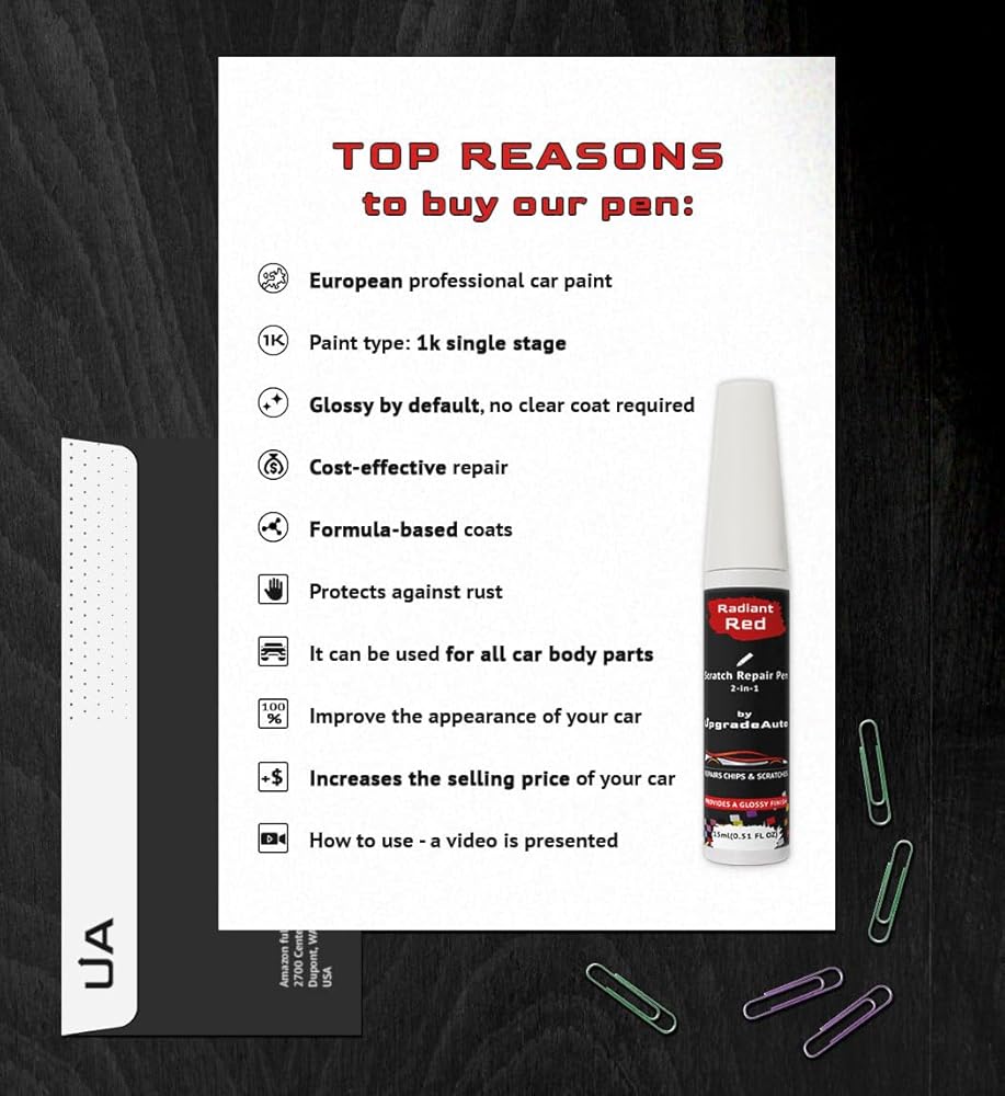UpgradeAuto Scratch Repair Pen, will cover your car's chips and scratches. The end result will be glossy and presentable.