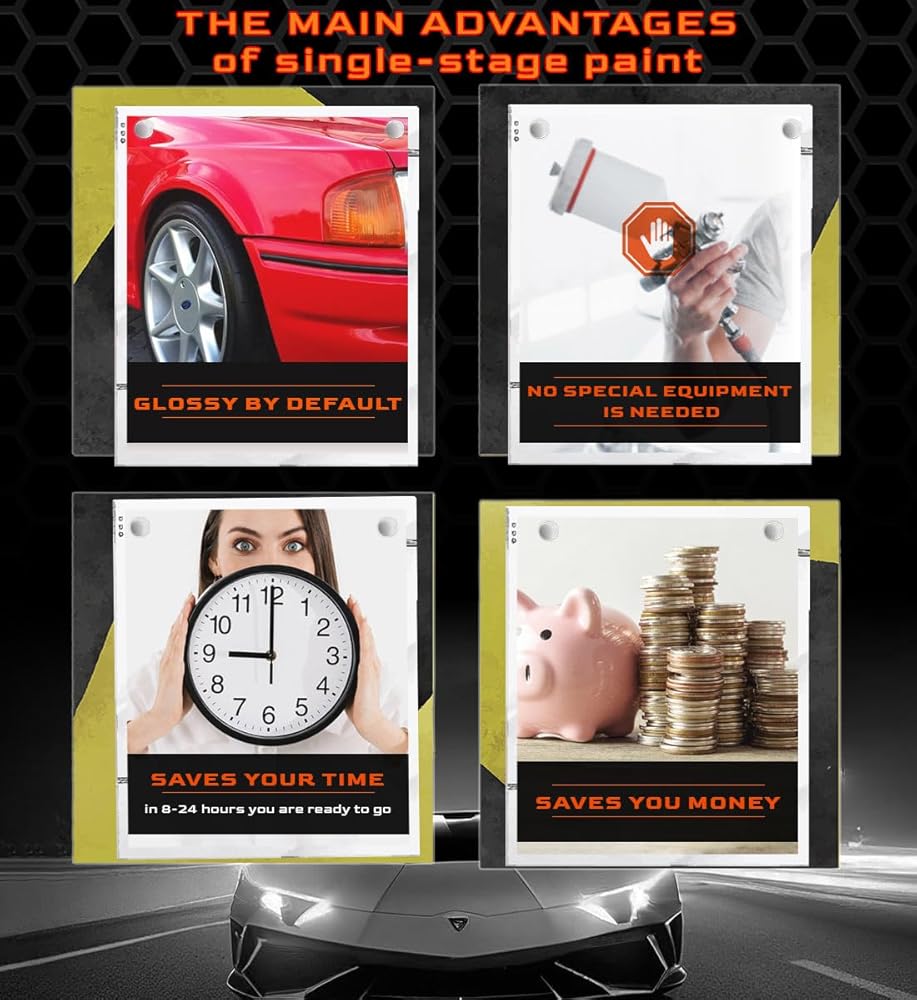 • ✅ Single-stage application -> The single-stage method has 3 main advantages in terms of: application time, preparatory work and cost. Compared to two-stage painting, in this case, more preparatory work will be required. And you may also need professional tools and the help of an auto painter for the two-stage method.
