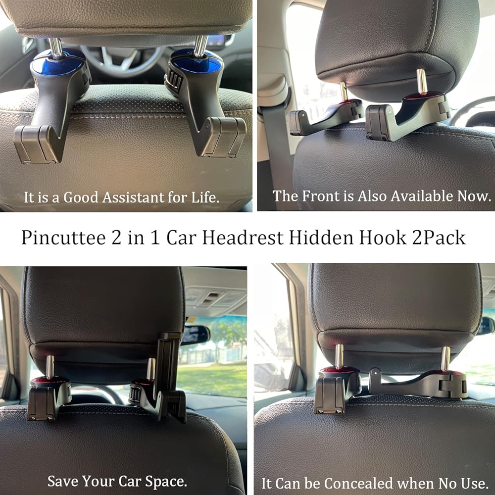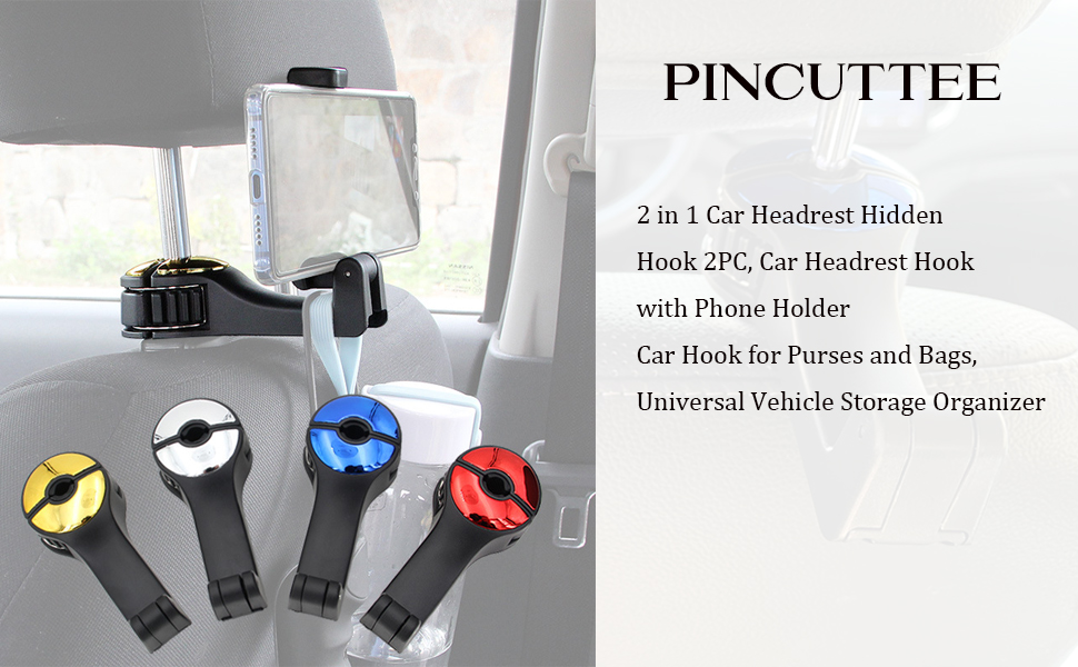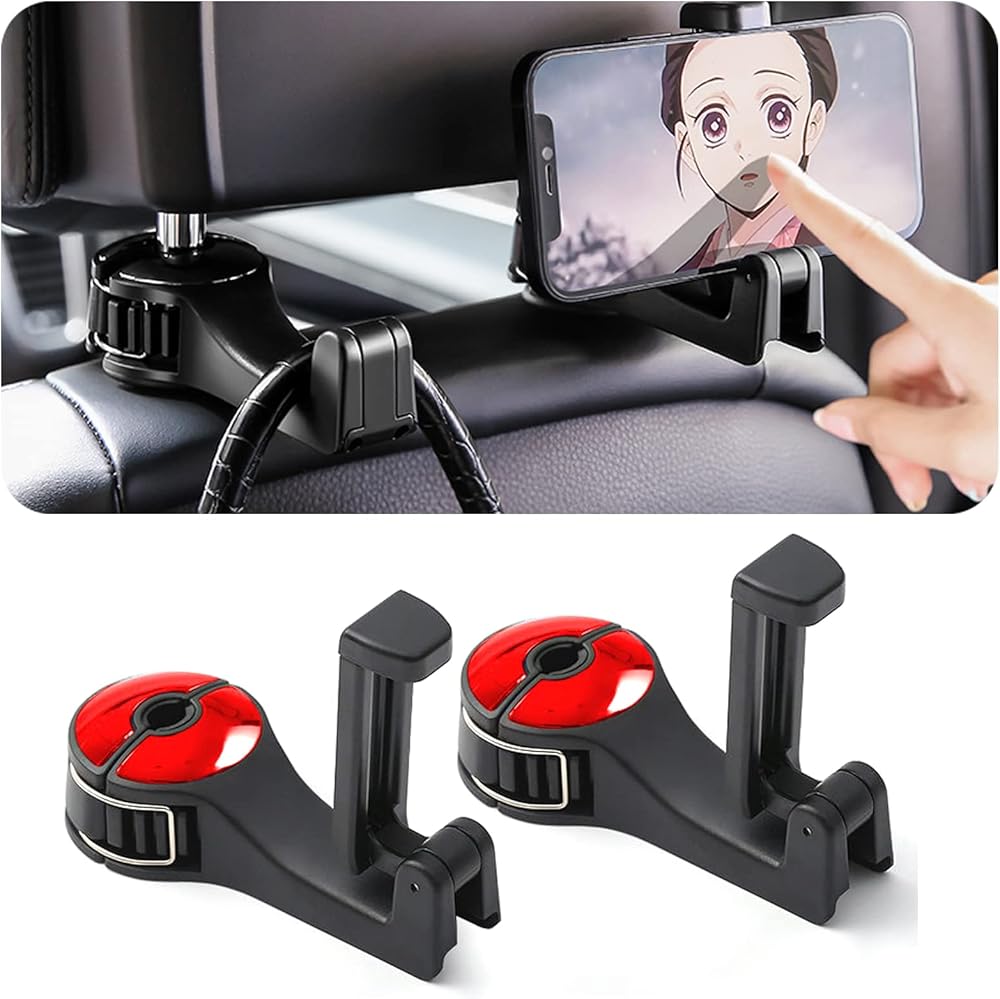 Pincuttee 2 في 1 مسند رأس السيارة خطاف مخفي 2 حزمة، خطاف مسند رأس السيارة مع حامل هاتف، خطاف ظهر المقعد للمحافظ والحقائب، منظم تخزين المركبات العالمي (أحمر، قطعتين)