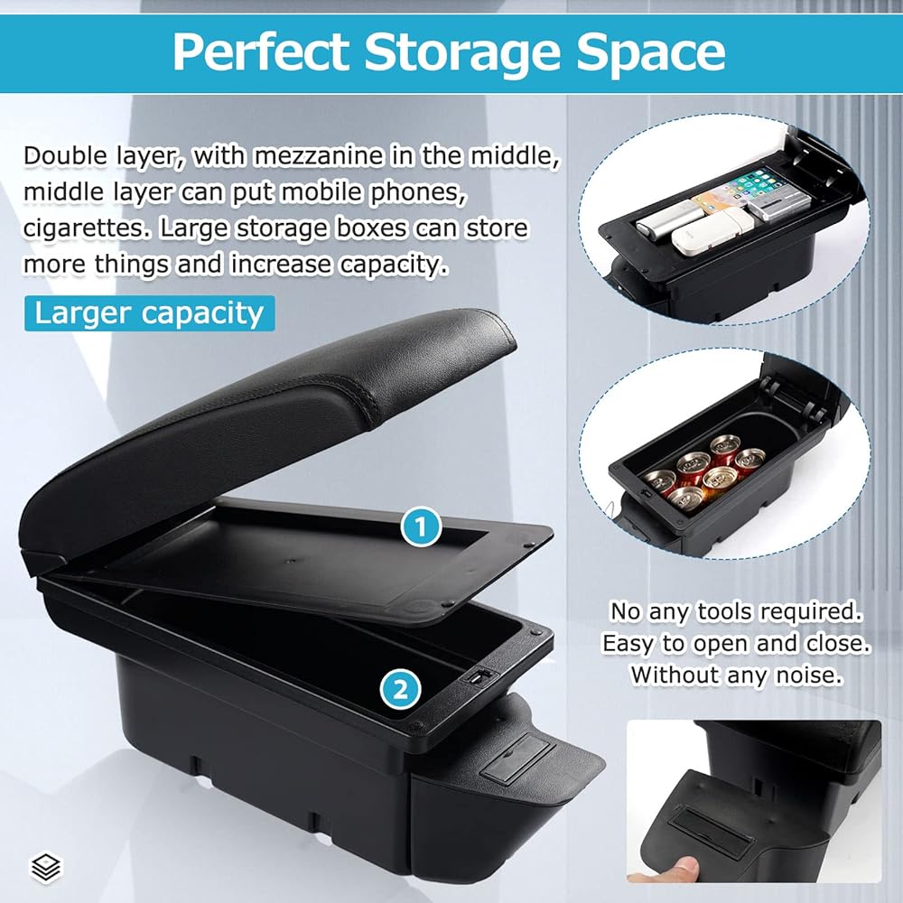 سهل التركيب —— فقط ضع صندوق مسند الذراع في الموضع خلف فرامل اليد من خلال الضغط. لا يتطلب أي أدوات. سهل الفتح والإغلاق. بدون أي ضجيج.