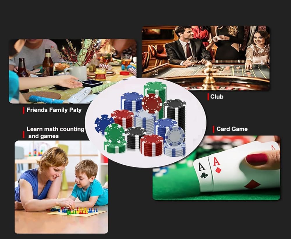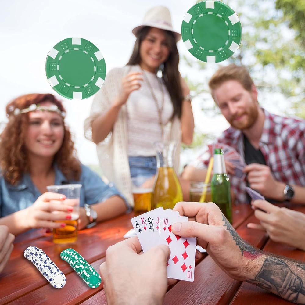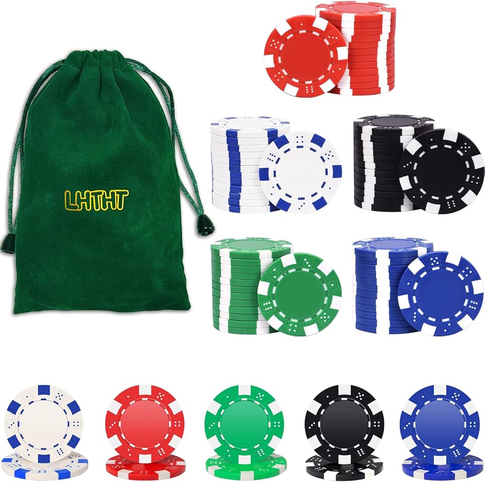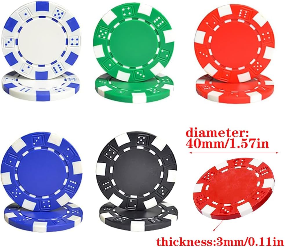 رقائق البوكر - تأتي مع حقيبة مخملية فاخرة، مما يجعل من السهل تخزين الرقائق والسفر بها. تم إعداد رقائق البوكر الملونة الأكثر شعبية لك: 20 رقاقة بيضاء، 20 رقاقة حمراء، 20 رقاقة خضراء، 20 رقاقة زرقاء داكنة و20 رقاقة سوداء، بإجمالي 5 ألوان مختلفة، 20 من كل لون، بإجمالي 100 رقاقة.