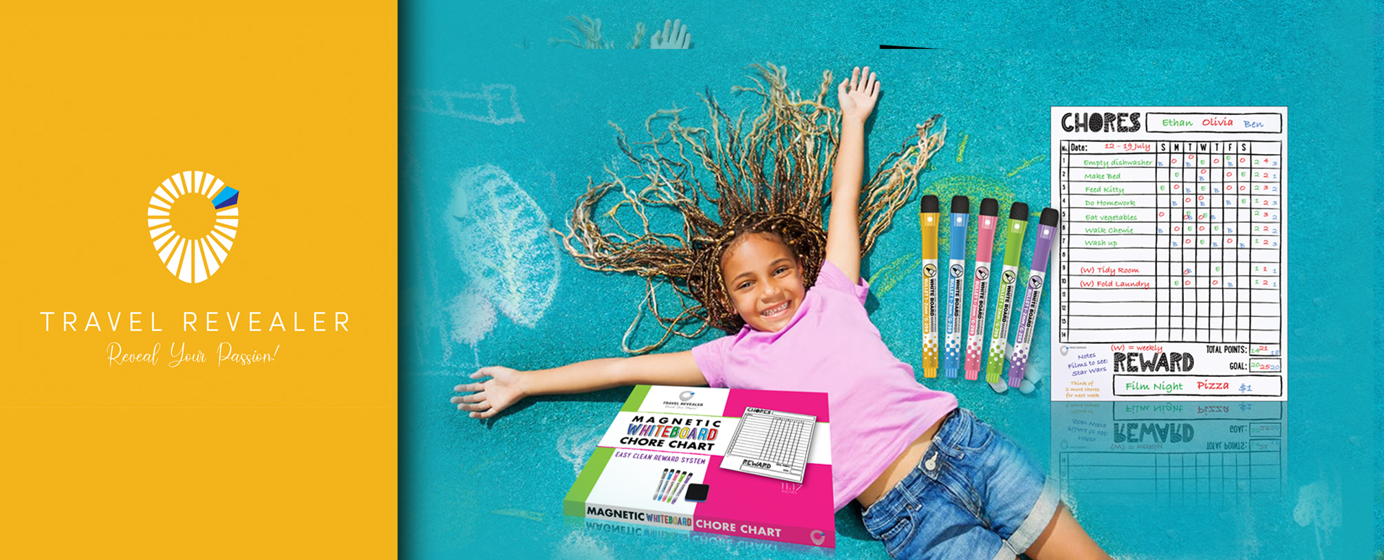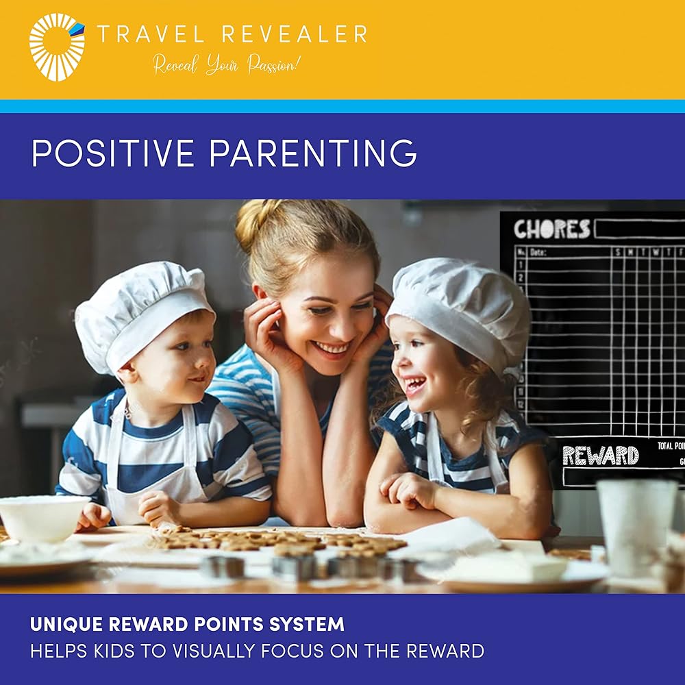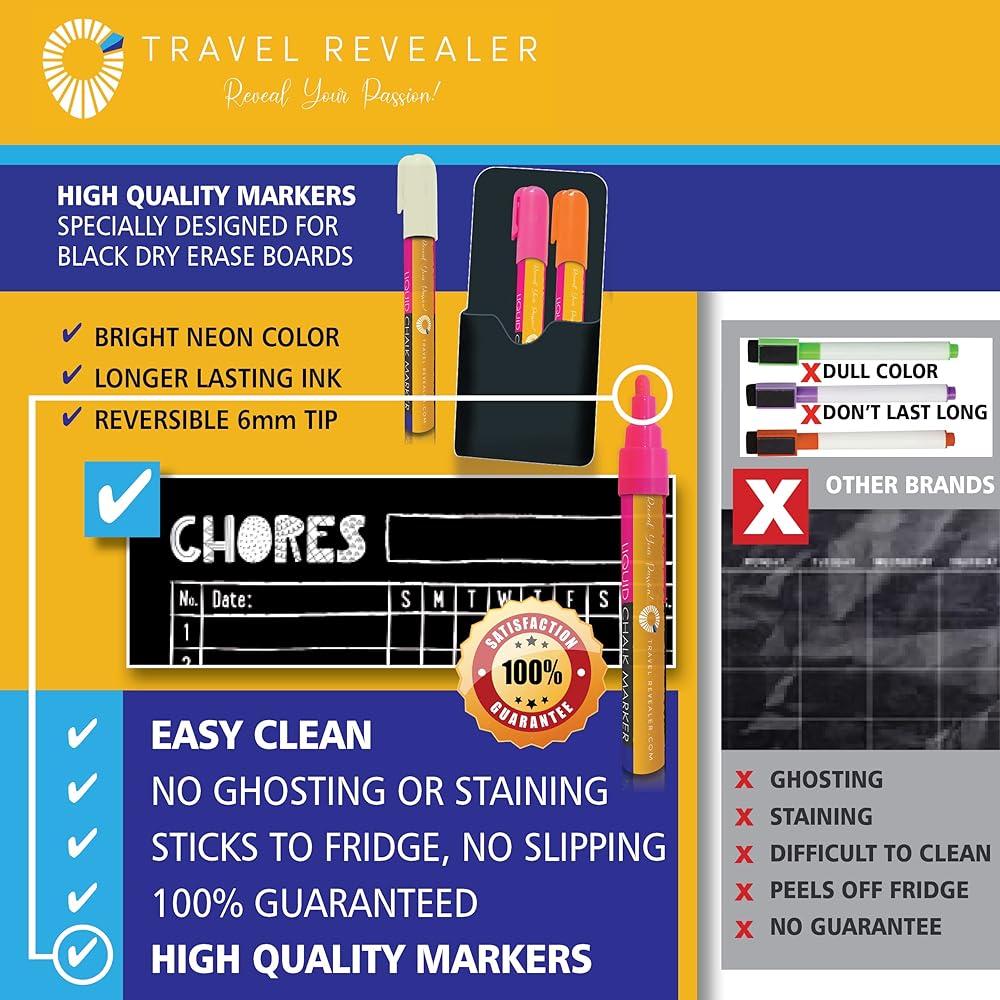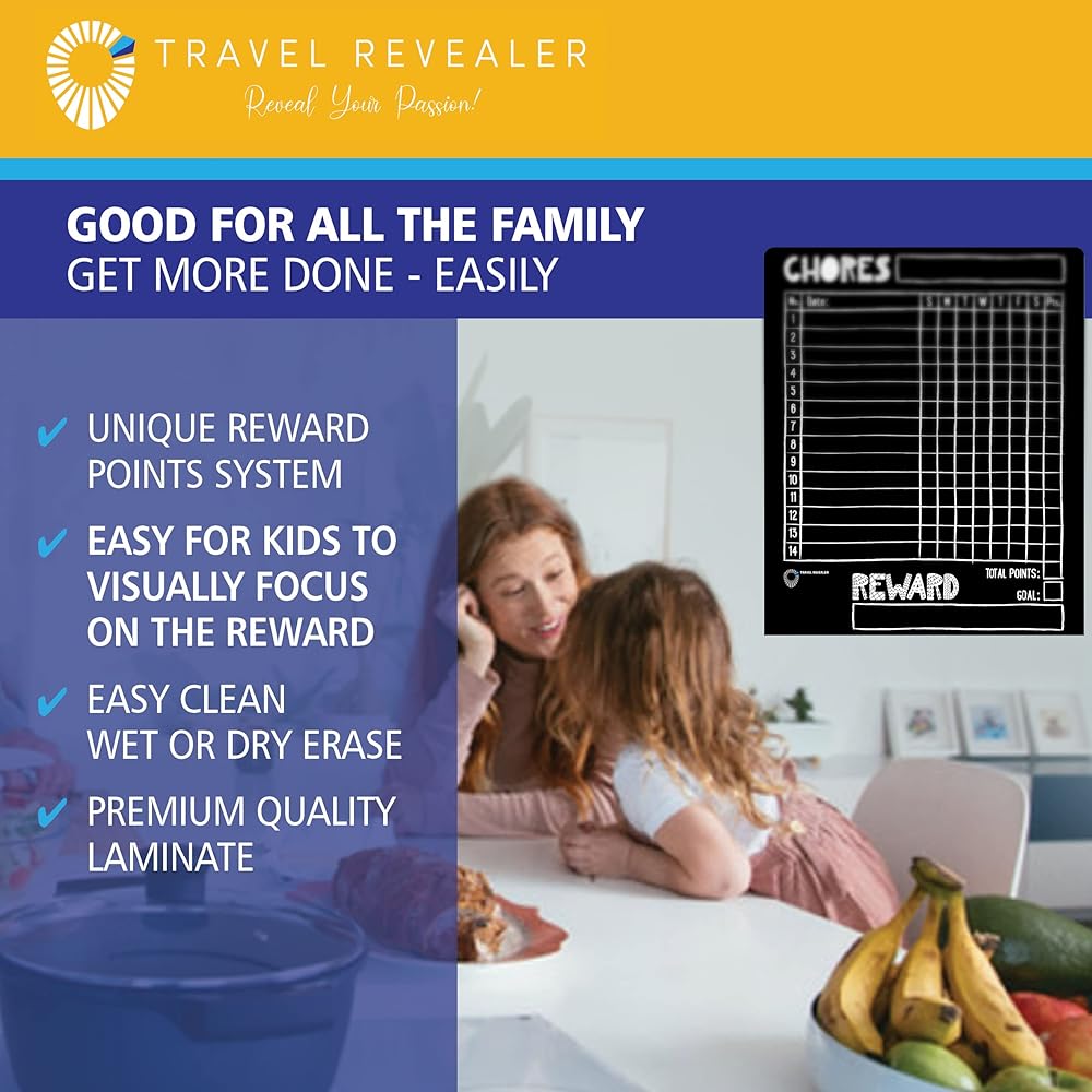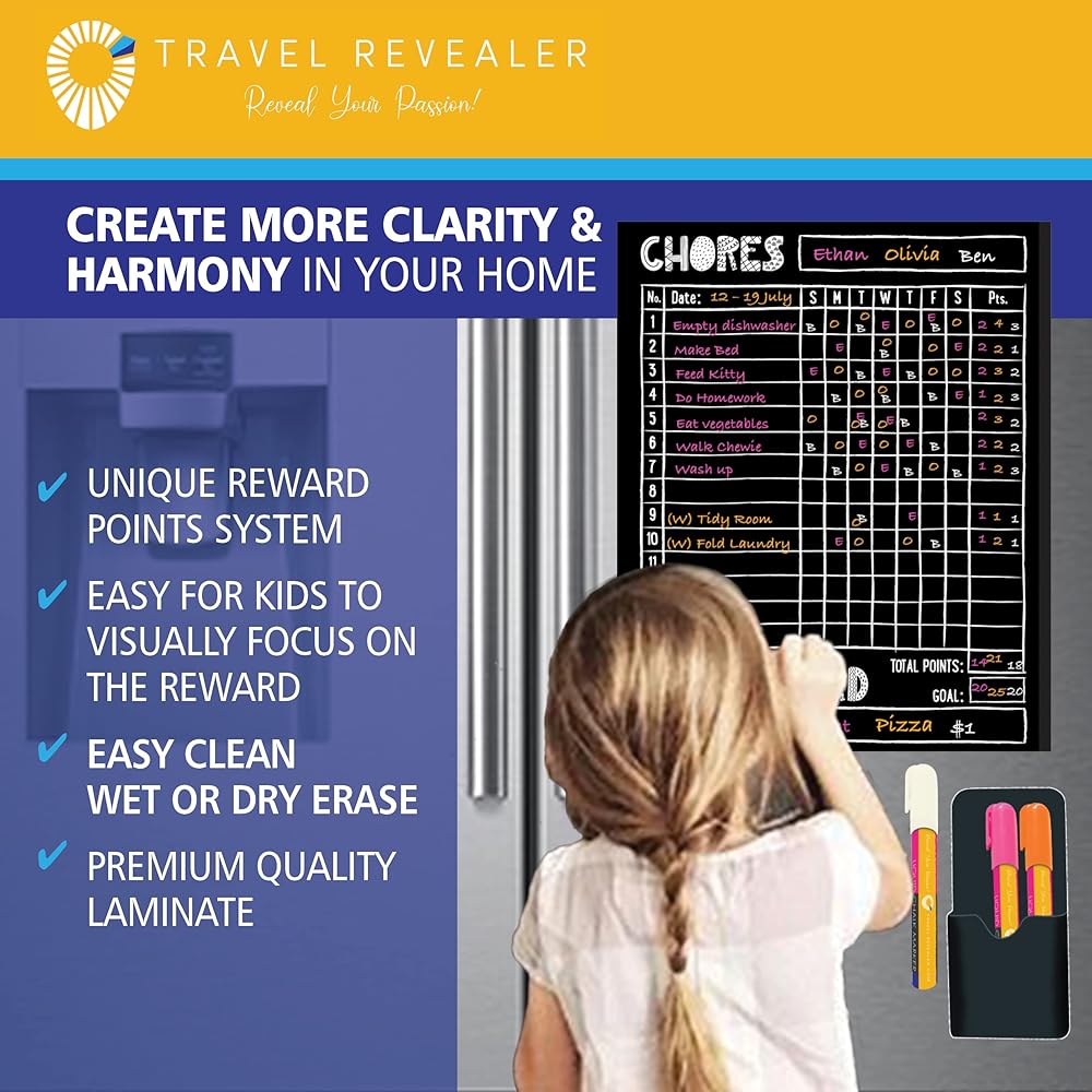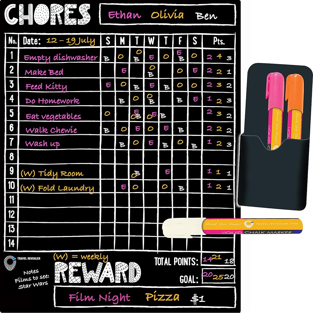 نظام مخطط مكافآت الأعمال الروتينية من Travel Revealer للأطفال - يشتمل على مخطط مهام مغناطيسي للمسح الجاف بالإضافة إلى 5 أقلام طباشير سائلة مغناطيسية أيضًا للثلاجة. مخطط المكافآت الكامل للأطفال والعائلة بأكملها