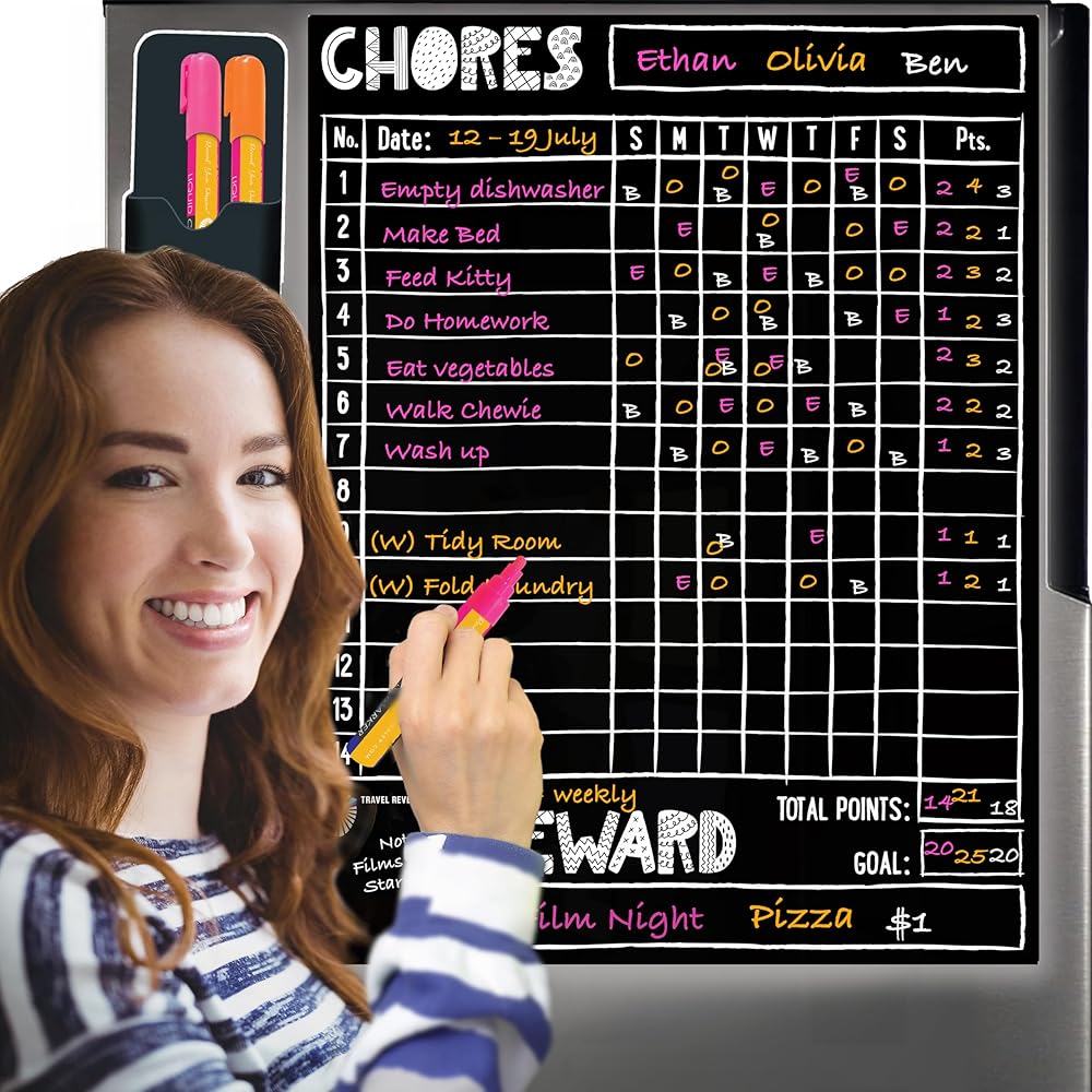 سهل التنظيف ويلتصق بقوة - يتيح الجزء الخلفي المغناطيسي لمخطط العمل قبضة سهلة على ثلاجتك دون انزلاق. من السهل تغيير موضعها. ما عليك سوى وضع مخطط المكافآت المغناطيسي الخاص بك للأطفال الذين لديهم علامات مغناطيسية على الثلاجة وانظر كيف يمكن أن تكون الأعمال المنزلية ممتعة! يرجى التأكد من أن ثلاجتك يمكن أن تدعم المغناطيس. ابق منظمًا لسنوات قادمة