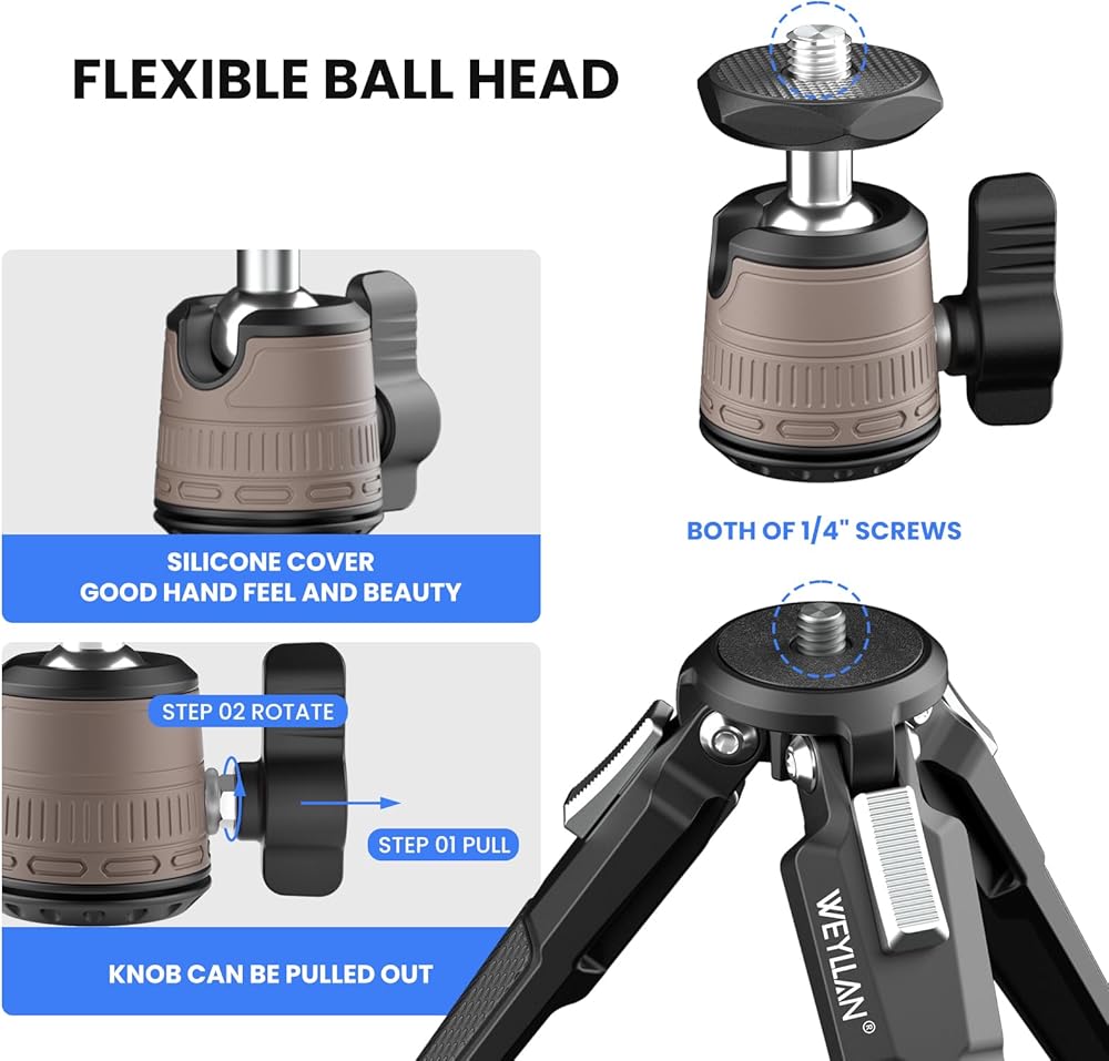 • 👍【رأس كروي قابل للفصل】رأس الكرة للحامل ثلاثي القوائم DT3 قابل للفصل، فتحة سفلية ملولبة 1/4 بوصة متوافقة مع المزيد من حامل ثلاثي القوائم. لا يزال الحامل ثلاثي القوائم الصغير DT3 مزودًا بمسمار تثبيت مقاس 1/4 بوصة بعد فصل رأس الكرة.