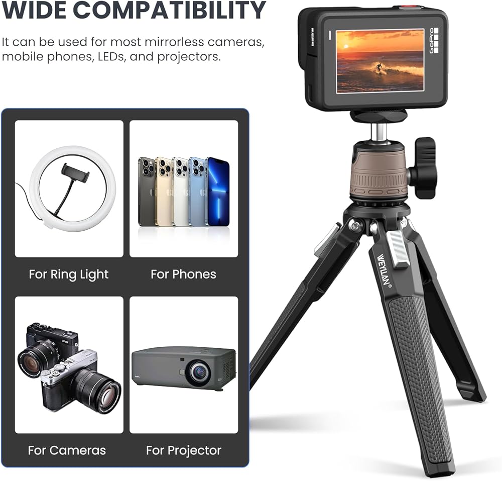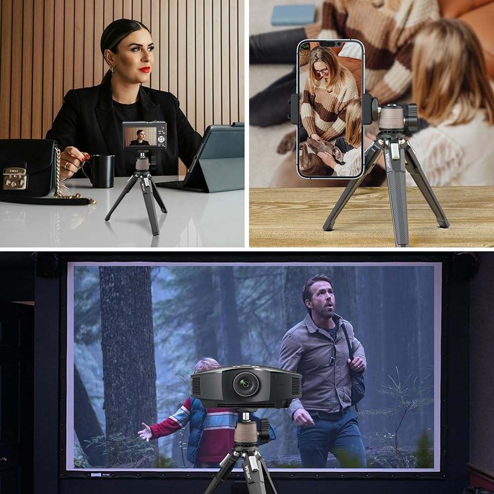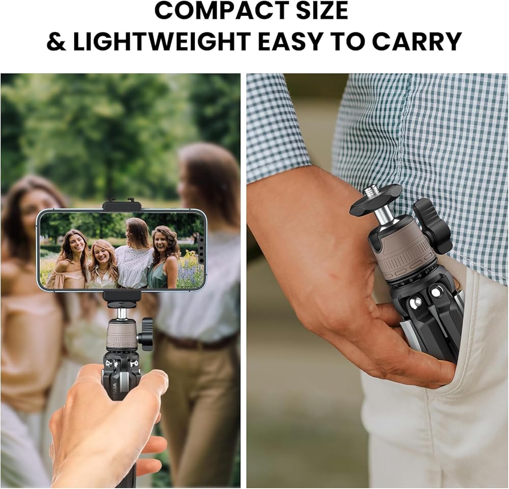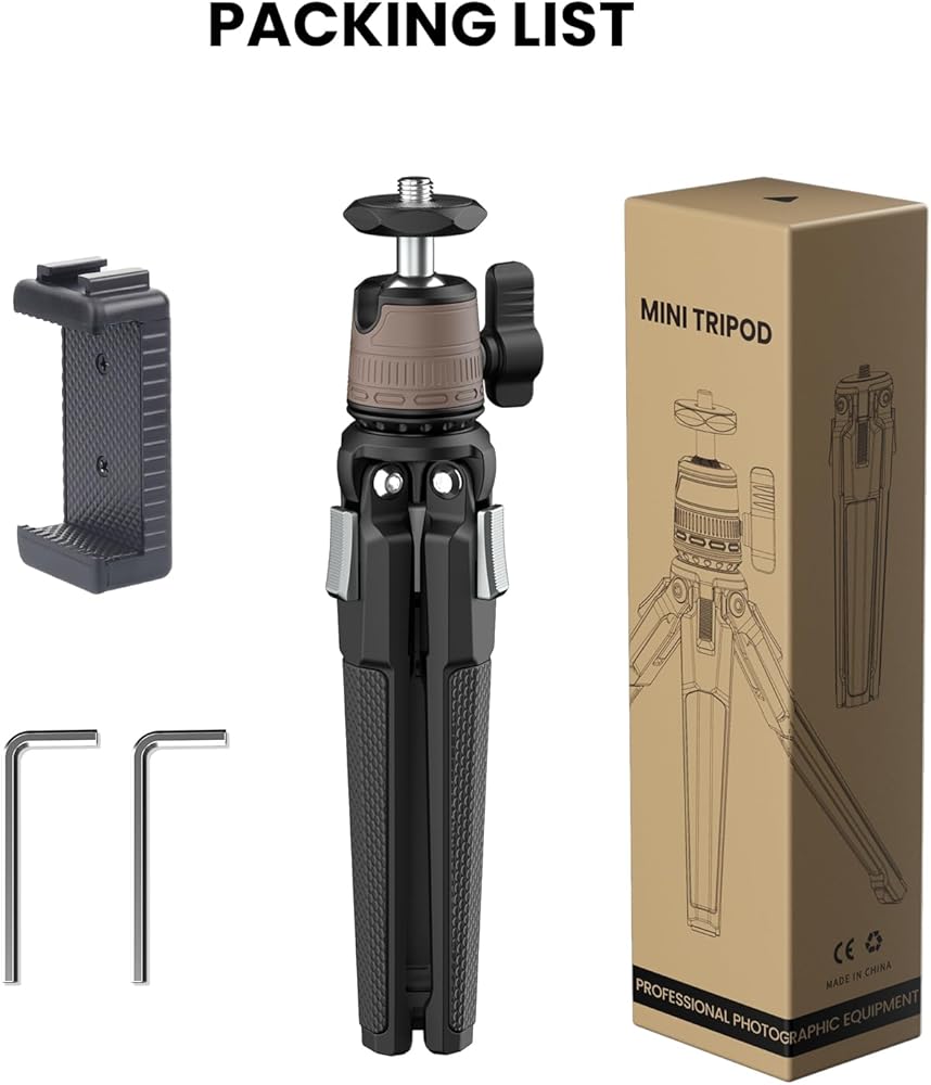 • 👍【توافق واسع】الرأس الكروي للحامل ثلاثي القوائم لسطح المكتب DT3 مع برغي تثبيت 1/4 بوصة، متوافق مع الكاميرا وكاميرا الفيديو وGoPro والإضاءة الحلقية وجهاز العرض وما إلى ذلك. علاوة على ذلك، يأتي هذا الحامل الثلاثي الصغير مع مشبك تثبيت للهاتف الخلوي، مناسب سلسلة هواتف iPhone وهواتف Android.