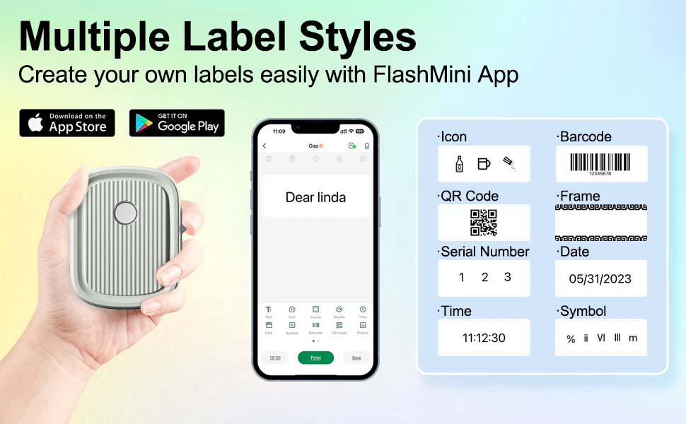 • حَسَنًا 𝐏𝐏: يمكن لطابعة الملصقات الحرارية الصغيرة هذه التي تعمل بتقنية البلوتوث طباعة الملصقات لاسلكيًا. ما عليك سوى تنزيل تطبيق "FlashMini"، ثم تحرير وطباعة الملصقات المخصصة الخاصة بك بسهولة بعد الاتصال والاقتران بالبلوتوث عبر التطبيق الذكي. ويدعم هاتف iOS وAndroid. (ملاحظة: لا يعمل صانع الملصقات هذا مع أجهزة الكمبيوتر.)