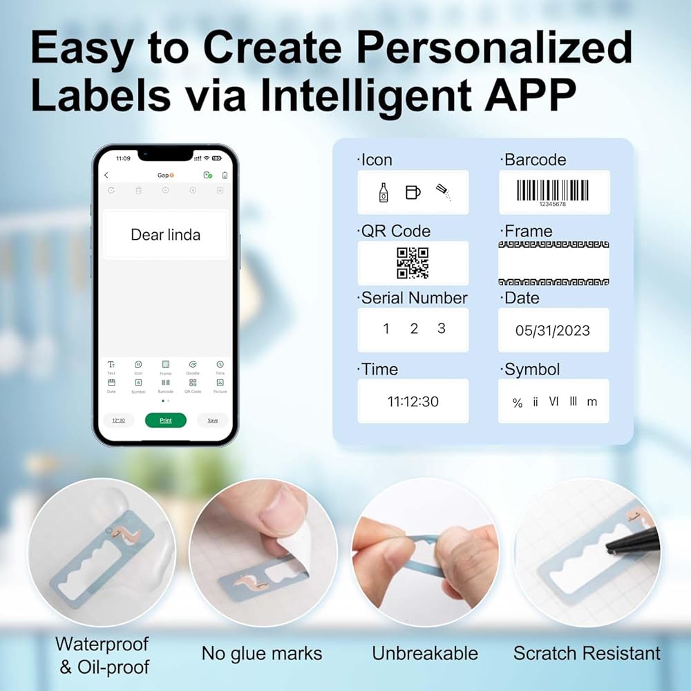• 𝐌𝐮𝐥𝐭𝐢𝐩𝐥𝐞 𝐋𝐚𝐛𝐞𝐥 𝐓𝐞𝐦𝐩𝐥𝐚𝐭𝐞𝐬: يوفر هذا التطبيق الخاص بصانع الملصقات مجموعة متنوعة من القوالب المجانية المصممة مسبقًا، بما في ذلك النص والأيقونة والإطار ورسومات الشعار المبتكرة والوقت والتاريخ، الرمز والباركود ورمز الاستجابة السريعة والرقم التسلسلي والمزيد. أسهل للطباعة المريحة والسريعة، قم بإنشاء ملصقات ملصقات متنوعة من هاتفك. أداة القطع الصغيرة المدمجة الآمنة تدعم كلاً من أشرطة ملصقات الفجوة وأشرطة الملصقات المستمرة. نصيحة: الحد الأقصى لطول الطباعة لمخزون الملصقات المستمر هو 5.9 بوصة.