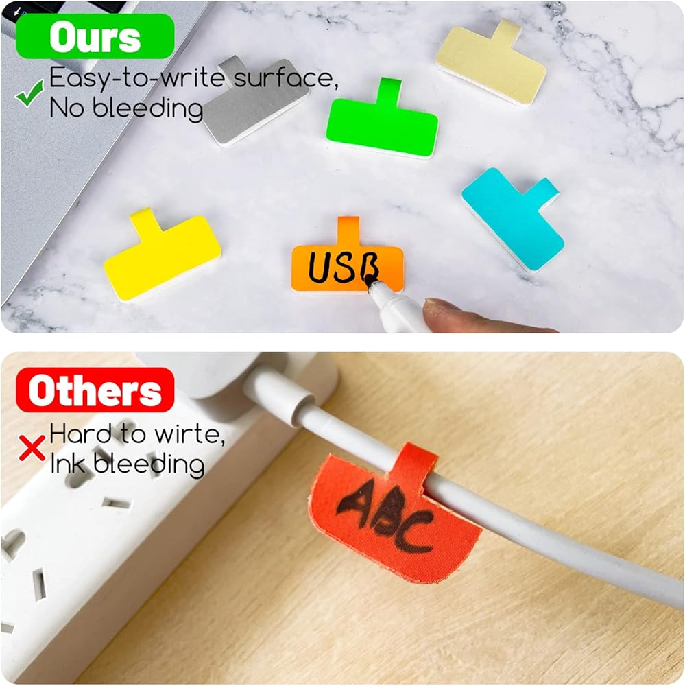 Separate the 2pcs of label tags, write on both sides and wrap the label over the wire then press two tabs together, so easy! You can open and re-attach them if you need. No sticky residue left.