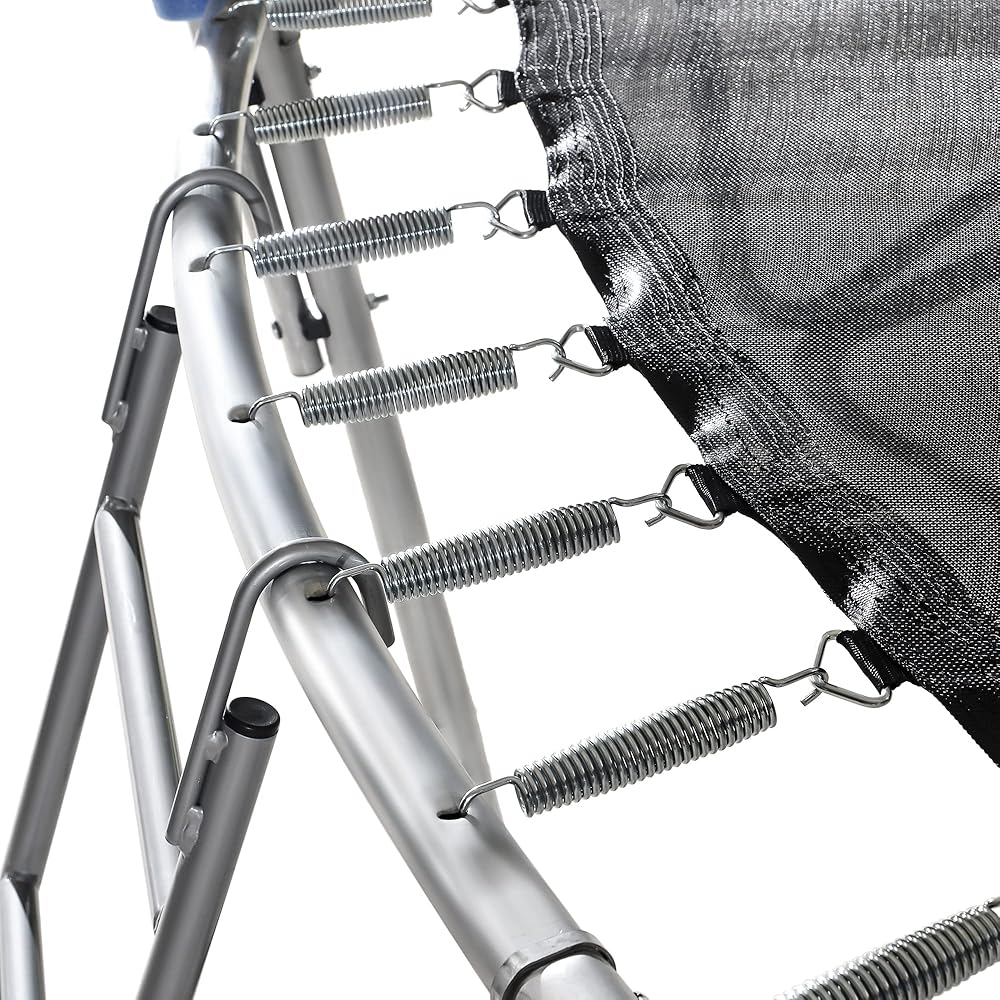 مصمم بمتانة - إطار فولاذي مجلفن ثقيل يشكل 6 أرجل على شكل حرف W مما يوفر قاعدة ثابتة لمنطقة القفز. يتم تثبيت الوصلات بالضغط على كل قطعة إطار لتقليل ضوضاء الإطار والحركة بين الأقسام، مما يقلل في النهاية من التآكل والتمزق بشكل عام.