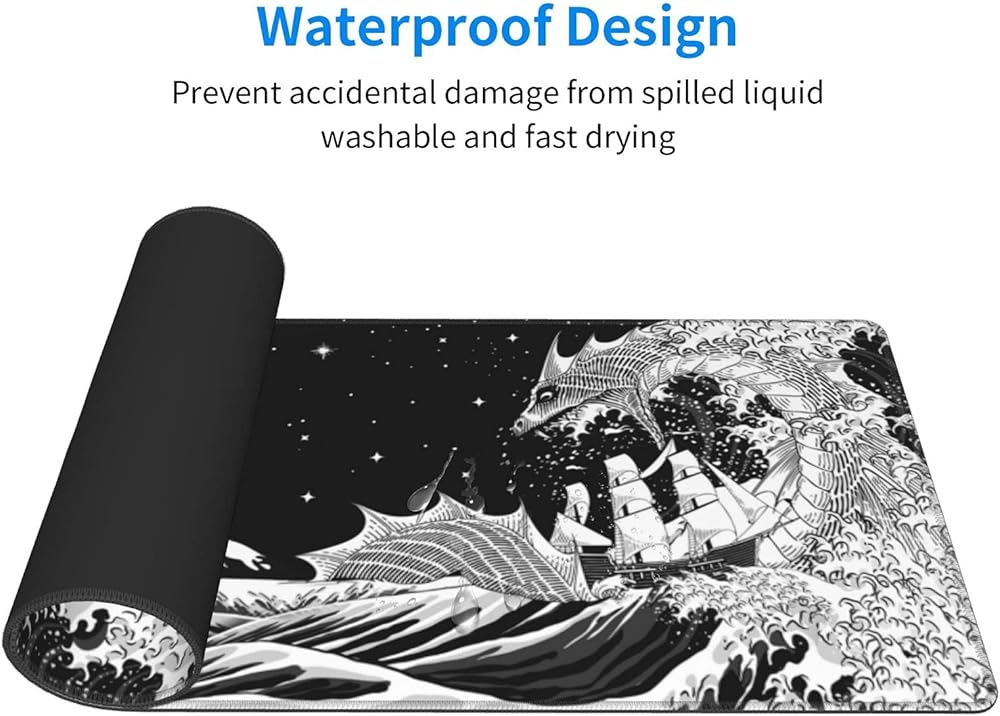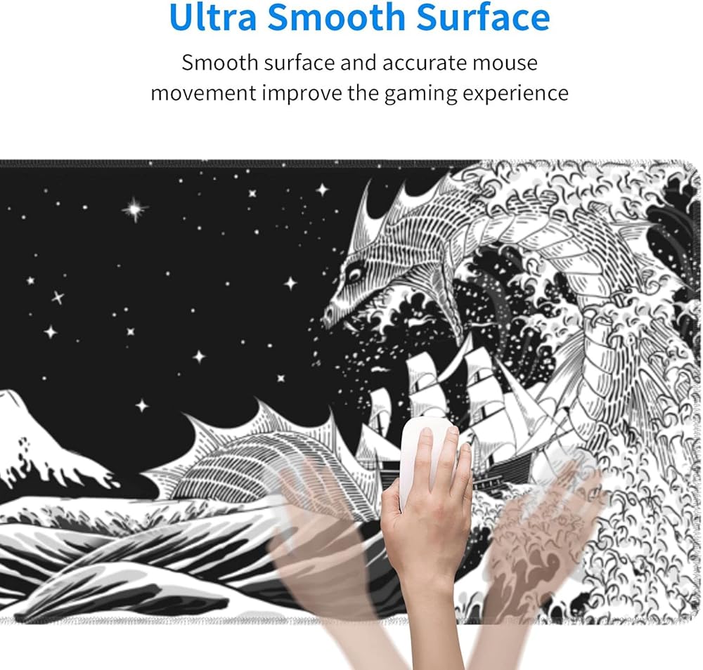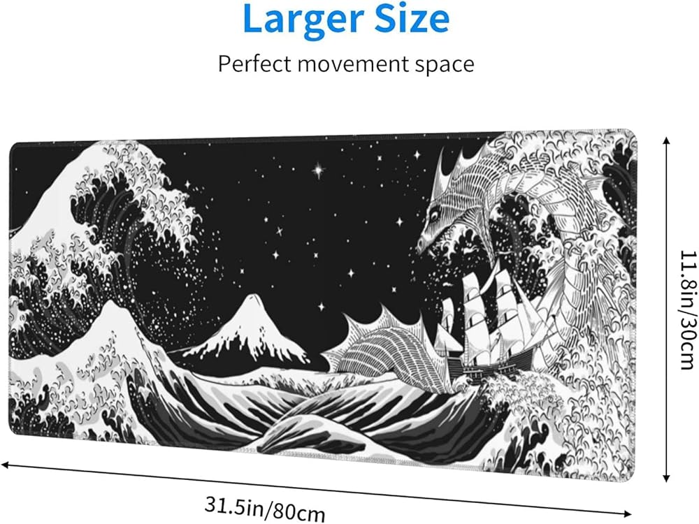 Black and White Japanese Waves Sea Dragon Gaming Mouse Pad XL, Extended Large Mouse Mat Desk Pad, Stitched Edges Mousepad, Long Non-Slip Rubber Base Mouse Pad