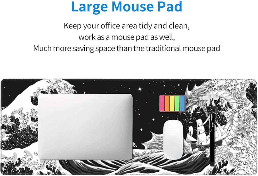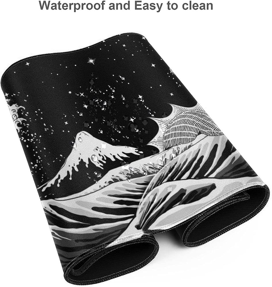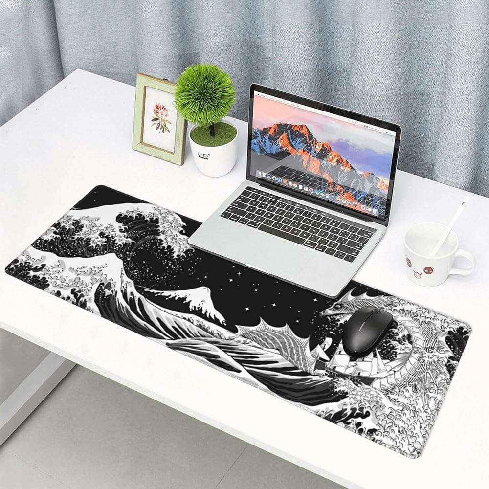 لوحة ماوس للألعاب باللونين الأبيض والأسود على شكل أمواج البحر اليابانية مقاس XL، وسادة مكتب كبيرة ممتدة، لوحة ماوس ذات حواف مخيطة، لوحة ماوس طويلة، 31.5 × 11.8 بوصة