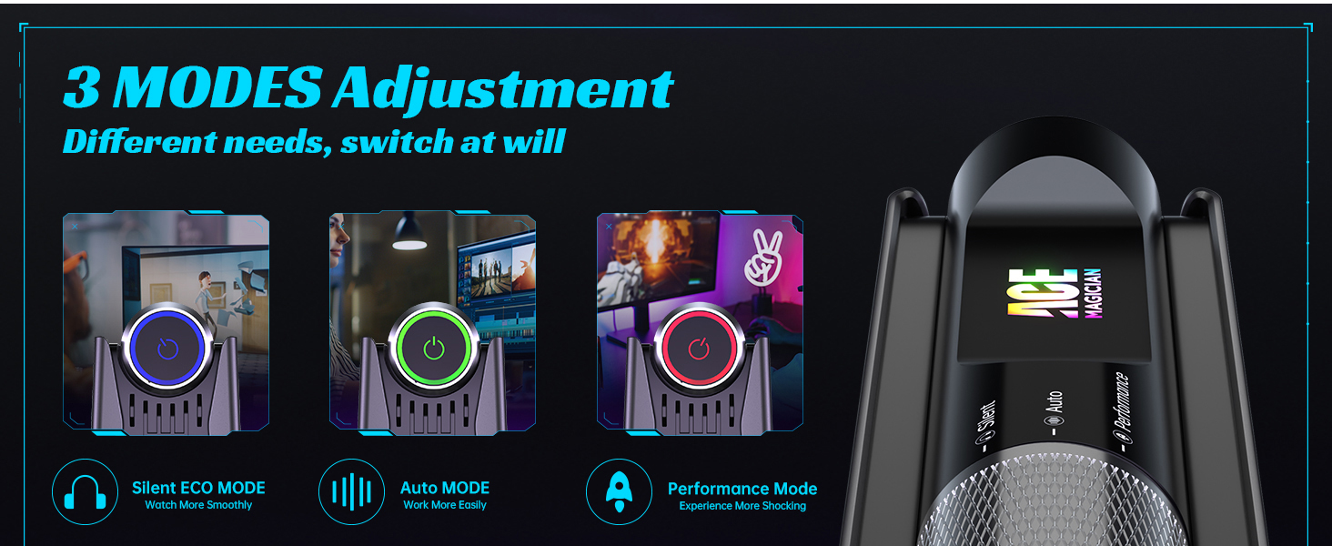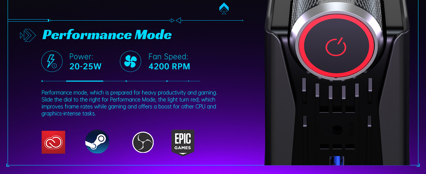 • كمبيوتر الألعاب ACE، كمبيوتر صغير متعدد الأوضاع، مزود بثلاثة أوضاع مختلفة لتناسب احتياجاتك. يعمل الوضع الصامت على تقليل صوت المروحة إلى ما يصل إلى 38 ديسيبل ويقلل من طاقة الكمبيوتر الصغير إلى 10-15 وات للبث الهادئ أو العمل الخفيف، بينما يستخدم الوضع التلقائي 15-20 وات من الطاقة وهو مثالي للعمل المتوسط ​​أو المشروعات الترفيهية. يوفر وضع الأداء، مع خرج طاقة يتراوح بين 20 و25 وات، تجربة الألعاب الأكثر كثافة.