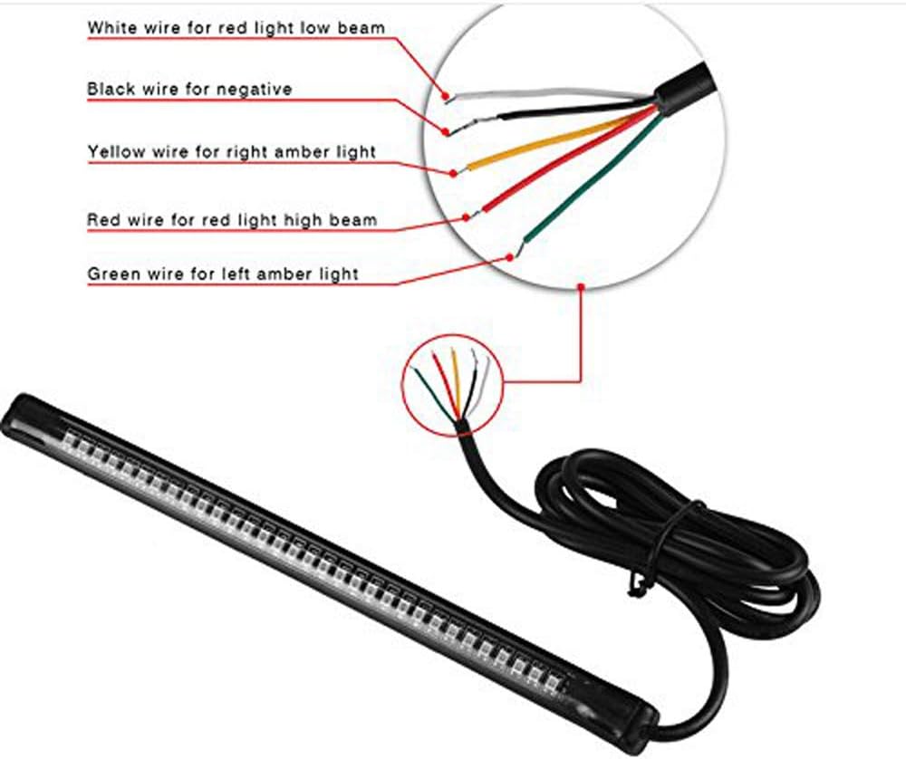 5 طرق اتصال الأسلاك: GND (سلك أسود)؛ الكبح (سلك أحمر)؛ تشغيل (سلك أبيض)؛ إشارة الانعطاف (الأسلاك الخضراء والزرقاء)