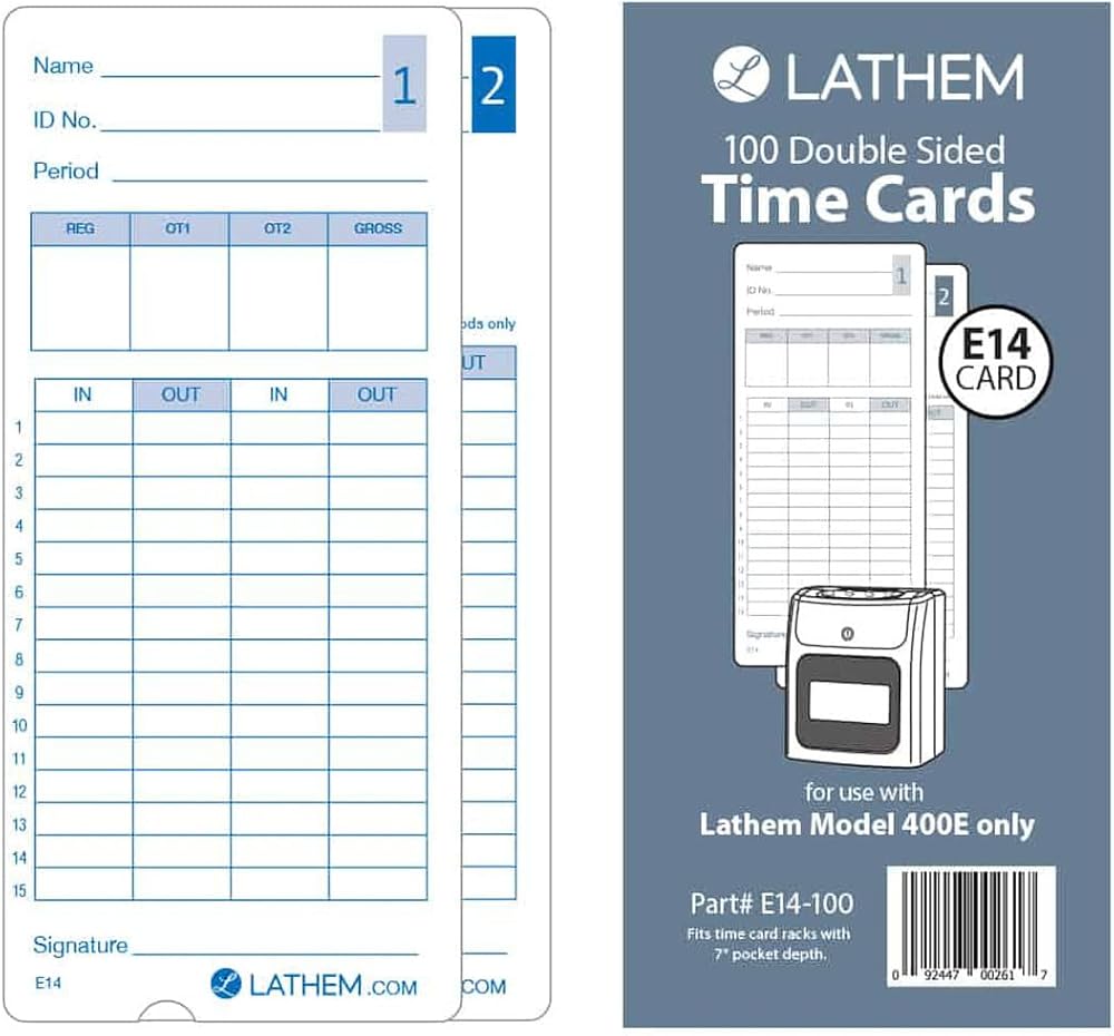 - Pack of 100 2-sided time cards for Lathem Model 400E time clock