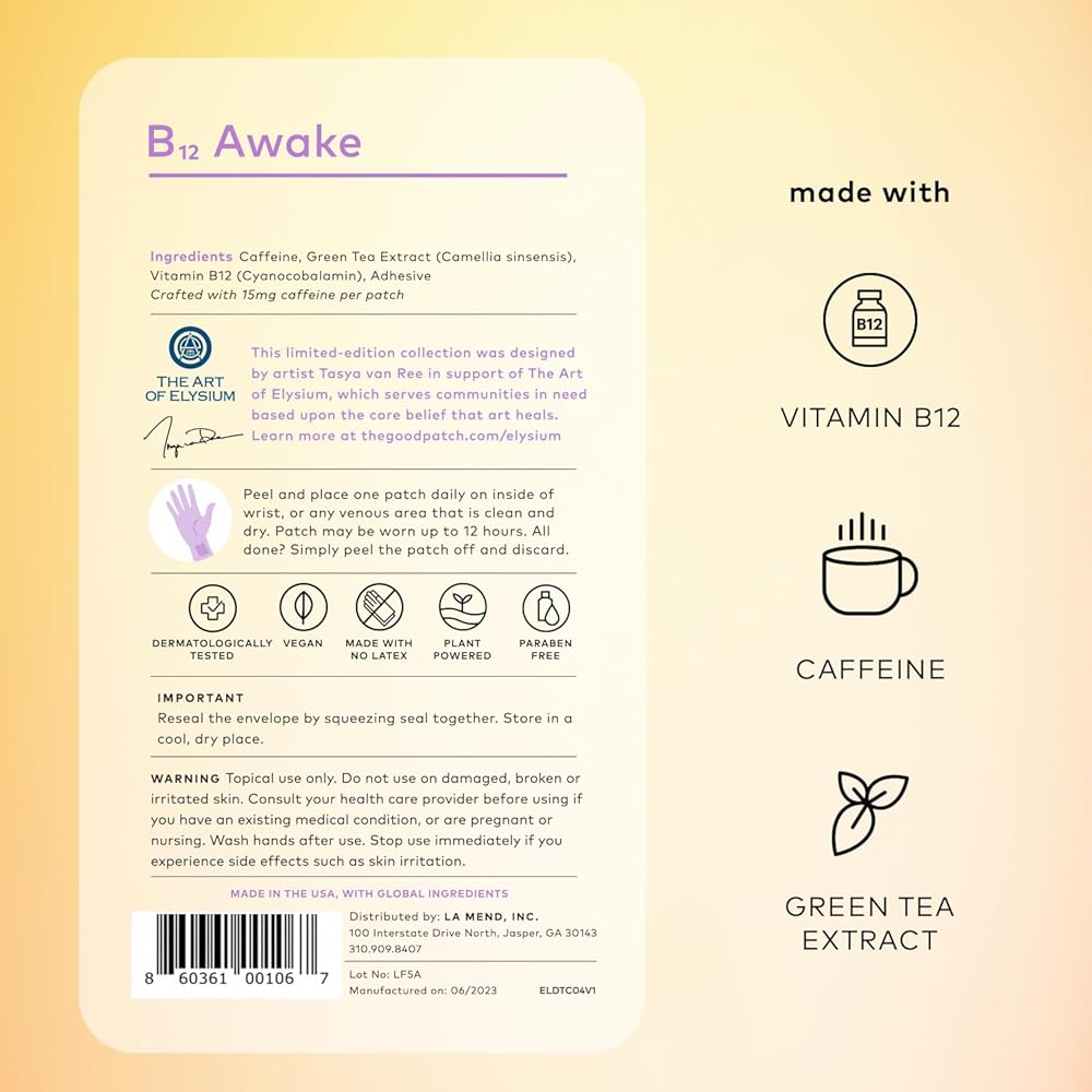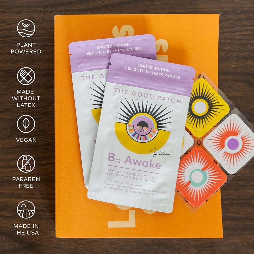 رقعة Good Patch B12 Awake التي صممها الفنان بمكونات نباتية، مملوءة بالكافيين وB12 ومستخلص الشاي الأخضر، مصممة لتمنح يومك دفعة (8 لصقات إجمالية)