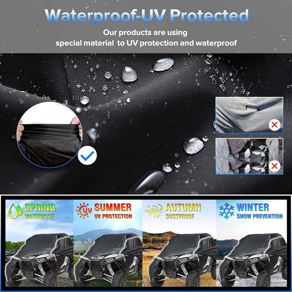 【 مقاوم للماء والأشعة فوق البنفسجية ومقاوم للتمزق 】غطاء UTV مصنوع من قماش أكسفورد عالي التحمل 210D مع طبقة بولي يوريثان مقاومة للماء على السطح وطلاء فضي مقاوم للأشعة فوق البنفسجية على الظهر. مع خصائص مقاومة للماء، ومسامية، ومقاومة للتمزق، ومقاومة للأشعة فوق البنفسجية، ومتينة، وعمر خدمة طويل. يعتمد الشريط المقاوم للماء على وصلة مزدوجة، لذلك حتى تحت ضغط الماء 2400 باسكال، ليس من السهل تسرب الماء.