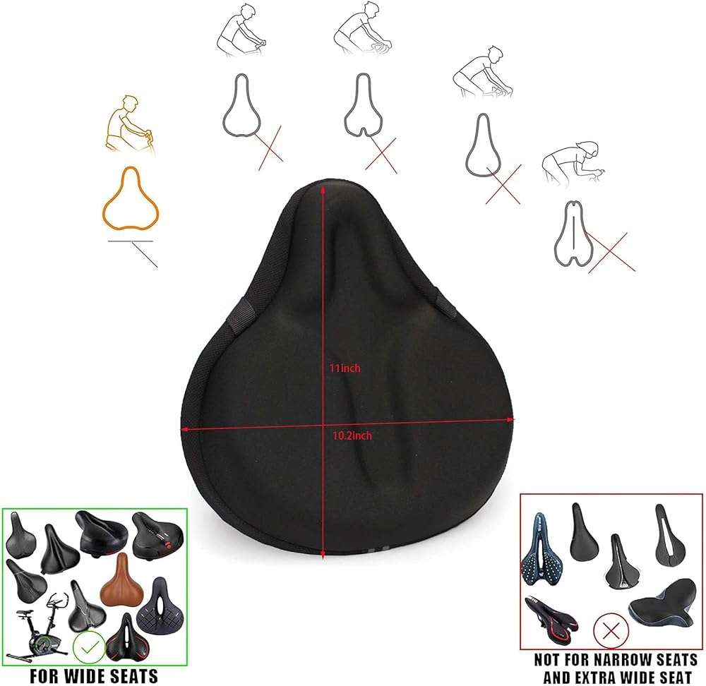 11inch Long x 10.2inch Wide, it can fit to 8.5-10inch Bike Seat. You can use this bike seat gel cover on cruiser beach bikes, road city bike , comfy exercise bikes. We recommend you double check the size of your saddle before ordering a cycle seat cushion. Strengthen Rope can be adjusted to fit the size of your seat.