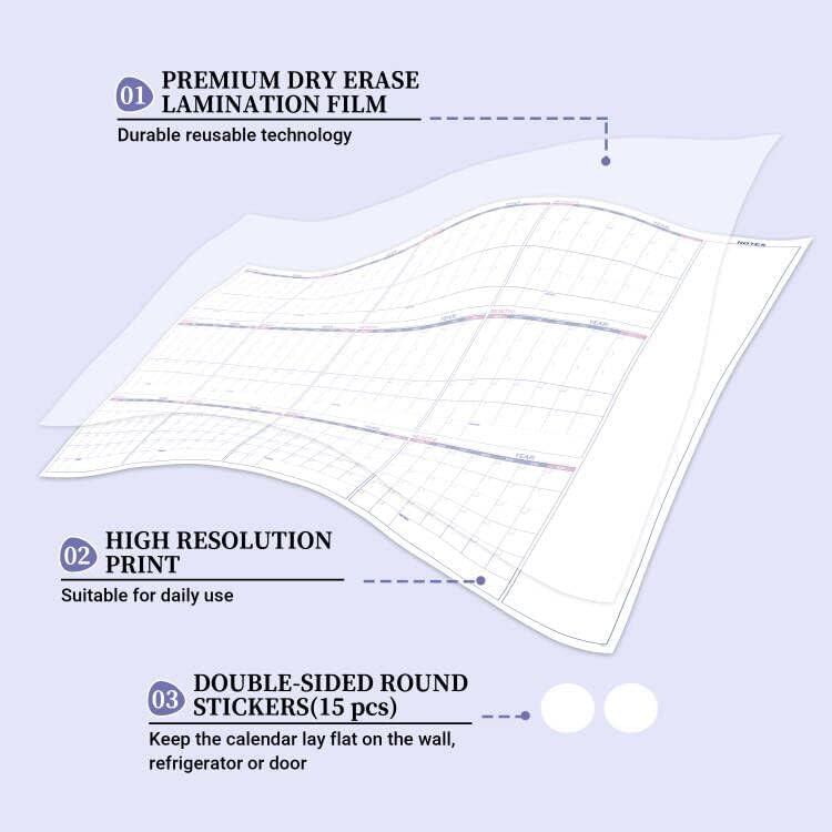 طبقة متينة وقابلة للمسح - هذا التقويم الجداري القابل للمسح يستخدم طبقة مغلفة من PET مع معالجة قابلة لإعادة الاستخدام وقابلة للمسح، والتي يمكن أن توفر تجربة كتابة سلسة بعد الاستخدام طويل الأمد ويمكن مسحها بسهولة دون أي بقايا، وهي متاحة لجميع أنواع المسح الرطب/الجاف. علامات.