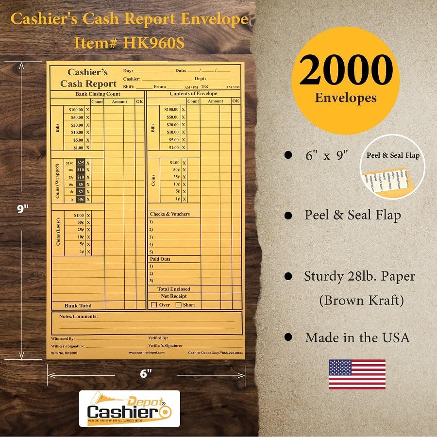 Our Cashier's Cash Report Envelopes Measure 6" x 9", These Money Envelopes Have a Form Printed on Front Side in Black Ink. Form is Simple and Very Easy to Use. Cashiers Can Record Both the Count of their Banks & Their Envelope Drops in Detail Currencies, Coins, Credit Card Charges, and any Other Forms of Payment. Form also has a Section for Paid Outs, Totals and Discrepancies with Room for Some Notes/ Comments. This Cash Envelope is a Perfect Size for Smaller Safes While It is Big Enough to hold Cash, Coins, Checks, Credit Card Receipts, Vouchers, Accounting Slips, Bank Reports and Much More, All Our Deposit Envelopes Are Designed with Wide Lines, Simple Fonts for Easier & Clearer Recordkeeping, 500 Envelopes per Box Made of Premium Sturdy 28lb Brown Kraft Paper, Envelope has a Strong Peel & Seal Flap to Keep all Money and Envelope Contents Secure, Cashier's Depot Cash Envelopes are Essential for Retailers, restaurants, hotels, Motels, Gas stations, banks, casinos, Clubs, Small Business offices, and many other businesses. Proudly Made Right Here in the USA for Over 10 Years
