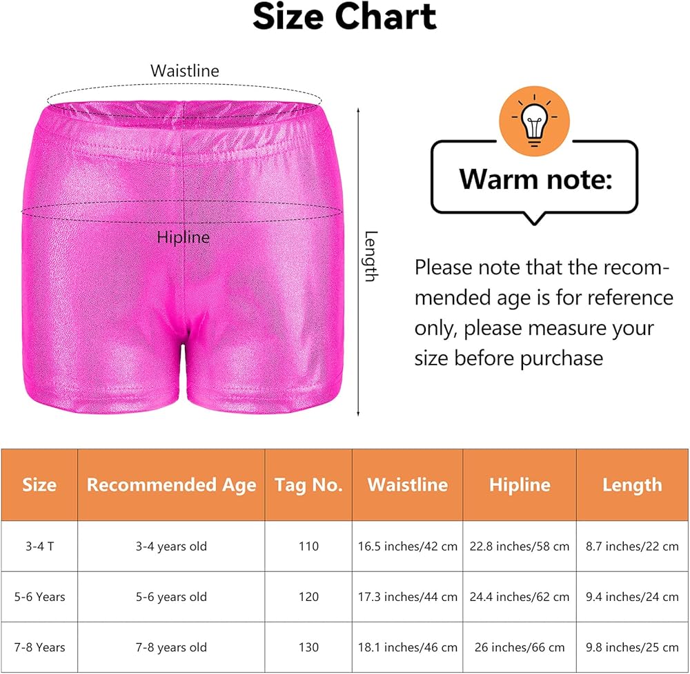 Product size: the 120 cm gymnastics shorts are suitable for most children aged 5-6 years; the gymnastics shorts measure 9.4 inches/24 cm in length, 17.3 inches/44 cm in waistline, and 24.4 inches/62 cm in hipline; please note that the recommended age is for reference only; please measure the size of your child so that the shorts fit