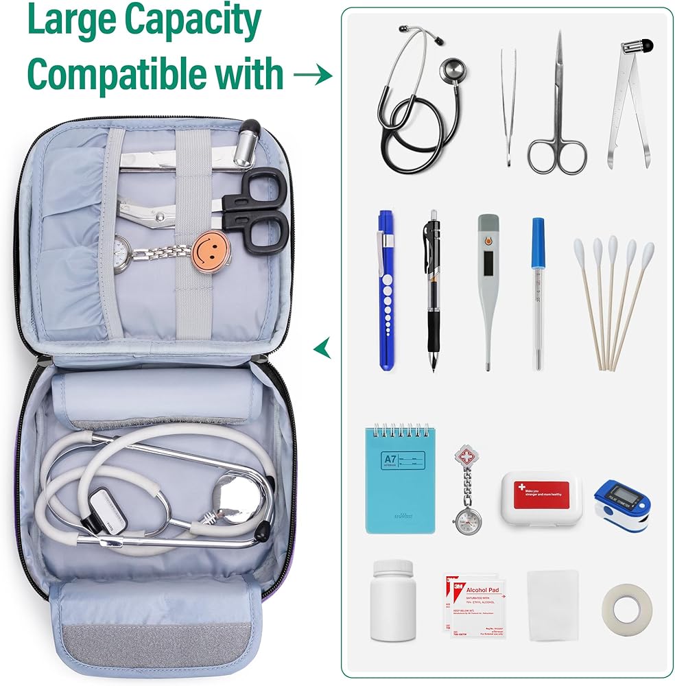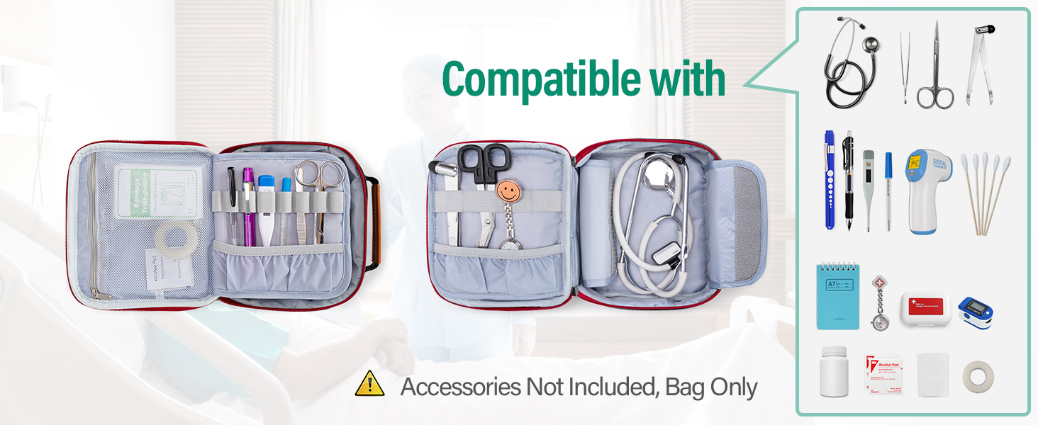 حافظ على الأمان - حلقات مرنة مختلفة بأحجام مختلفة تعمل على إصلاح أدواتك الصغيرة بشكل كبير وتمنعها من السقوط. الفتحة السفلية الواسعة لتنظيم سماعة الطبيب أو أجهزة مراقبة الجلوكوز أو غيرها من المعدات الصغيرة والحفاظ عليها آمنة.