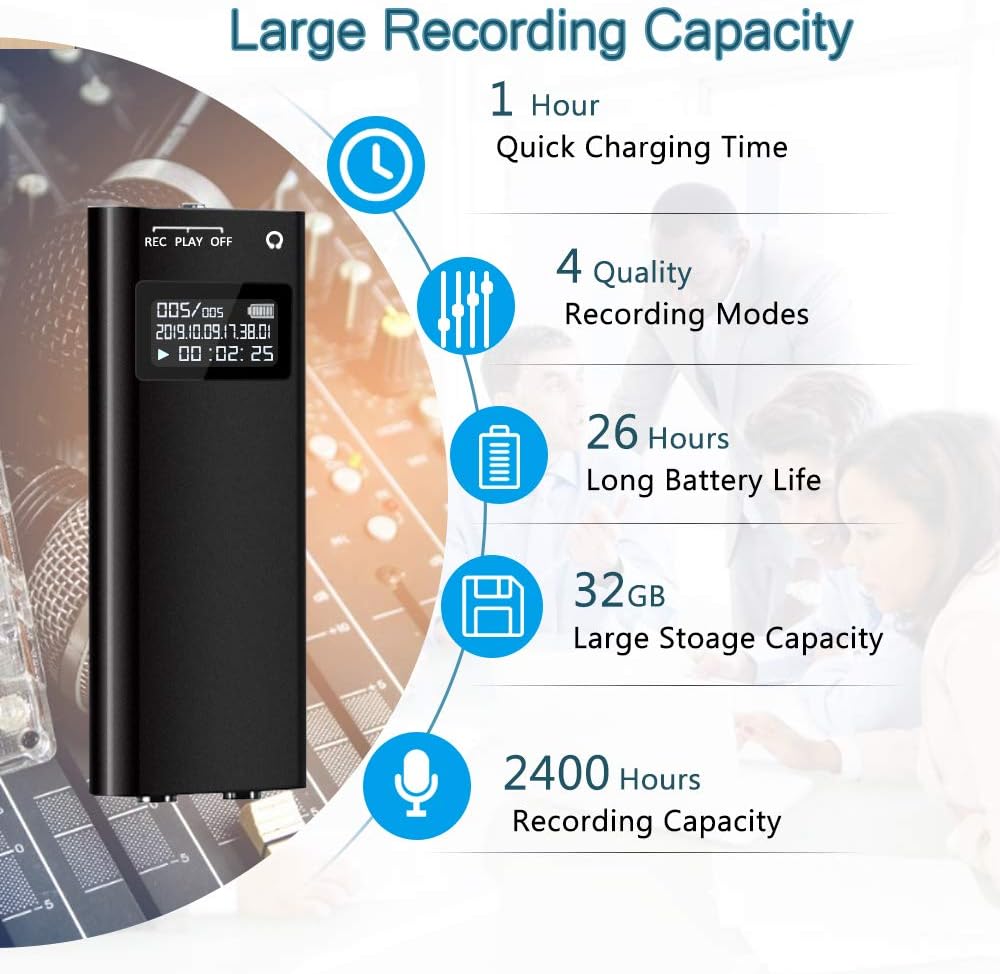 مسجل صوت، مسجل صوت منشط بسعة 32 جيجابايت، سعة تسجيل تصل إلى 2400 ساعة، عمر بطارية يصل إلى 26 ساعة، جهاز تسجيل صوتي للمحاضرات والاجتماعات - مغناطيس قوي، مشبك خلفي