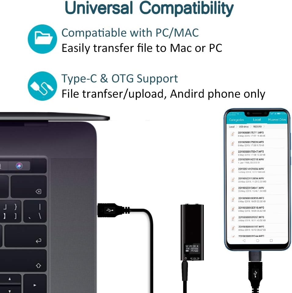 📝【سهلة الاستخدام ومتعددة الوظائف】- من خلال تحريك زر التسجيل/الإيقاف/التشغيل، يمكنك بسهولة بدء/حفظ/تشغيل التسجيل. تتبع تسجيلاتك باستخدام ختم التاريخ والوقت الموجود على التسجيلات، مما يجعل إدارة الملفات أسهل بكثير. دعم نقل الملفات إلى الهاتف (Android مع وظيفة OTG) تصميم المشبك الخلفي يجعل من السهل حملها مع ملابسك ومحفظتك وحقيبتك وما إلى ذلك.