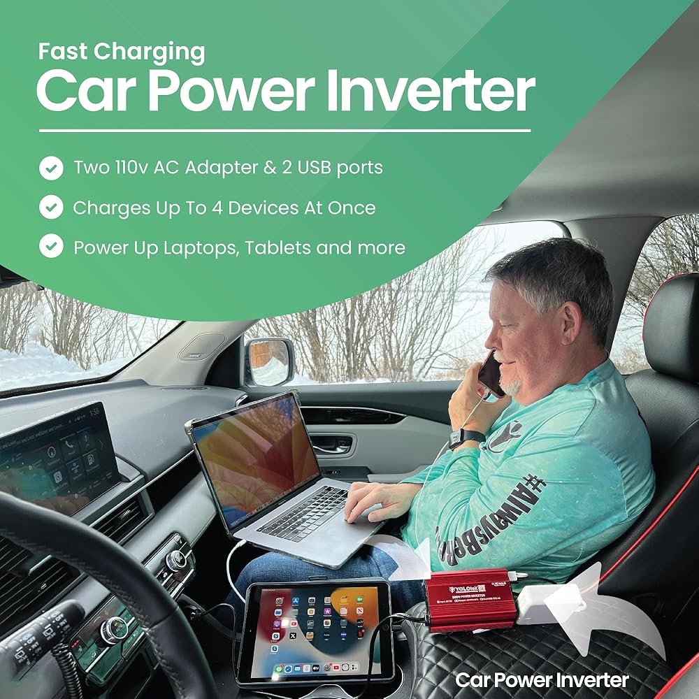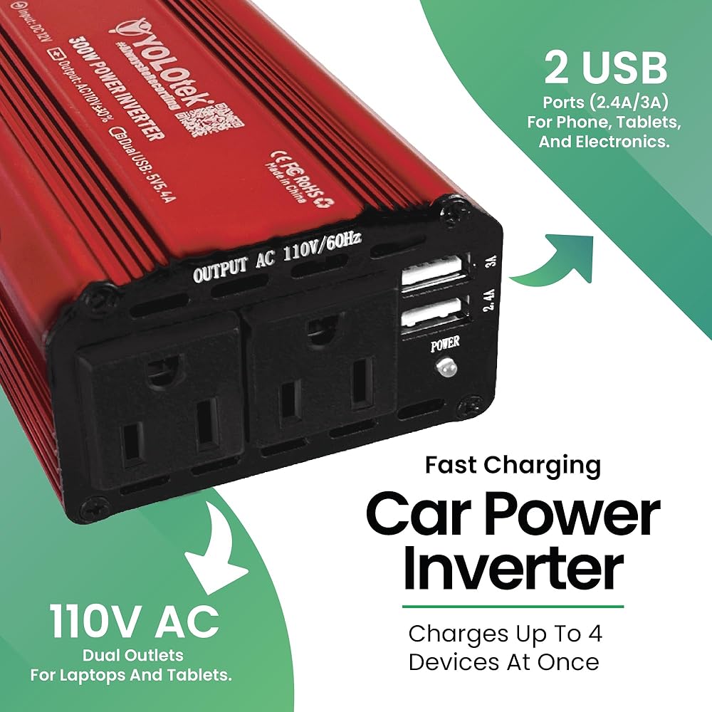 "Introducing Yolotek PowerUp, the ultimate solution for your portable power needs. Unleash the convenience of a steady 300 Watts of continuous DC to AC power, offering an impressive 700 Watts of reliable 12-volt power supply. With two AC outlets and two USB ports, Yolotek PowerUp is your trusted car adapter for plug outlet for on-the-go charging. Experience lightning-fast charging with the Quick Power Inverters, featuring two 110V AC car outlets for laptops and tablets, and two USB ports for your USB devices (0-2.4A). This versatile power inverter is a essential for all your mobile charging requirements. Designed with the utmost portability in mind, Yolotek PowerUp is as compact and light as a power bank, making it the ultimate companion for vacations, work trips, and camping adventures. The 24-inch cigarette lighter inverter ensures easy connectivity to almost any vehicle, ensuring you stay powered wherever you go. Safety is a top priority with Yolotek PowerUp. The built-in 40-amp fuse protects your devices, while the secure car charger port prevents overheating, under and over-voltage charging, and short-circuiting. Rest easy knowing your gadgets are in safe hands. Built to last, this power inverter boasts advanced protection against drops and bumps, ensuring the safety of your valuable car gadgets. The cooling fan system operates quietly, adjusting its speed when the output power exceeds 700W. Yolotek PowerUp combines durability and high performance, making it the go-to choice for all your portable power needs. Experience the freedom of reliable power with Yolotek PowerUp – because when it comes to staying connected, you only live once."