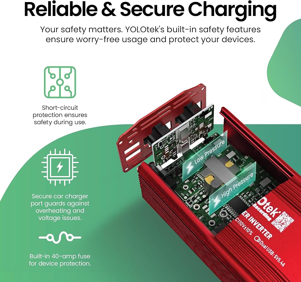 • Safety Features: Equipped with a built-in 40-amp fuse to safeguard your device. The secure car charger port offers protection from overheating, under and over-voltage charging, and short-circuiting.
