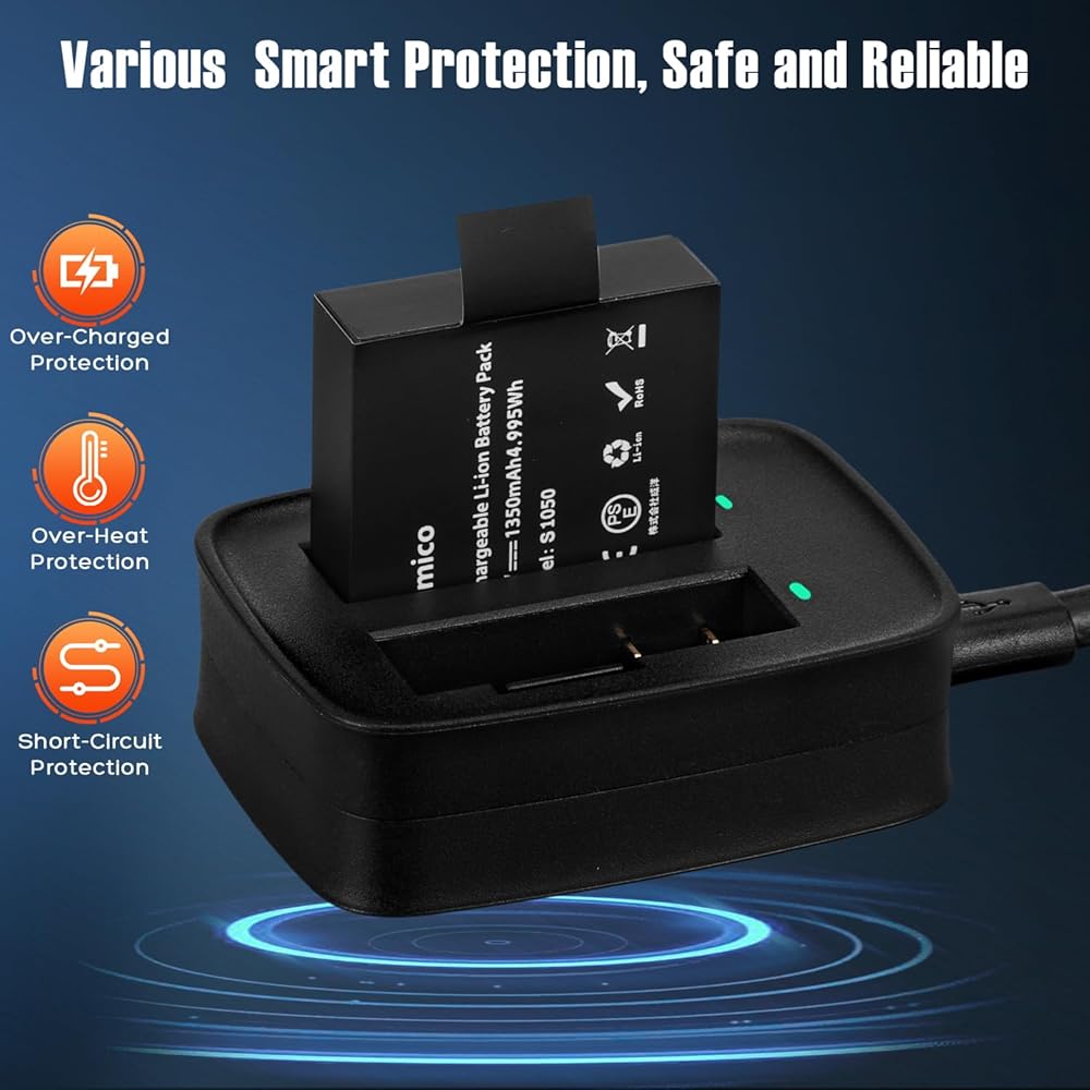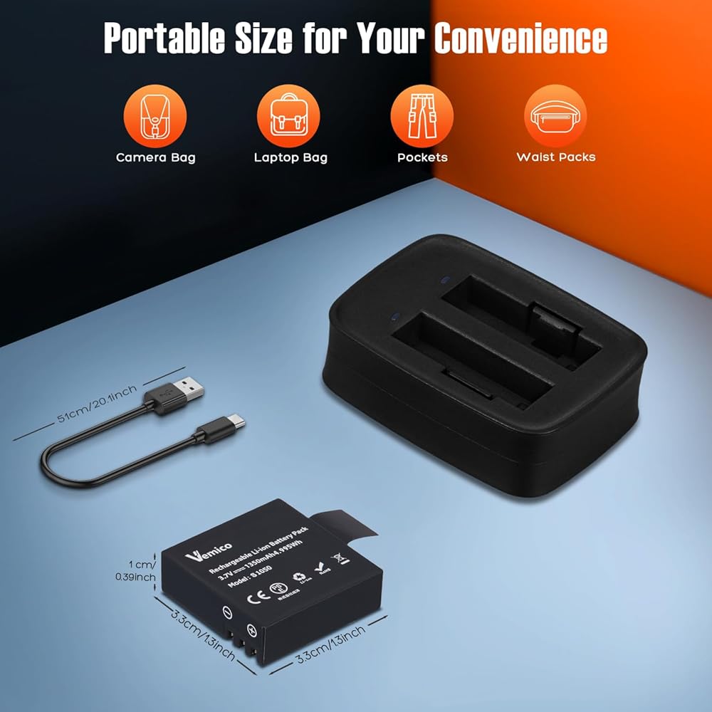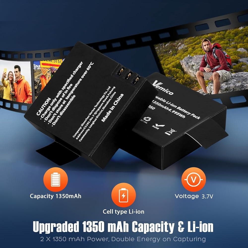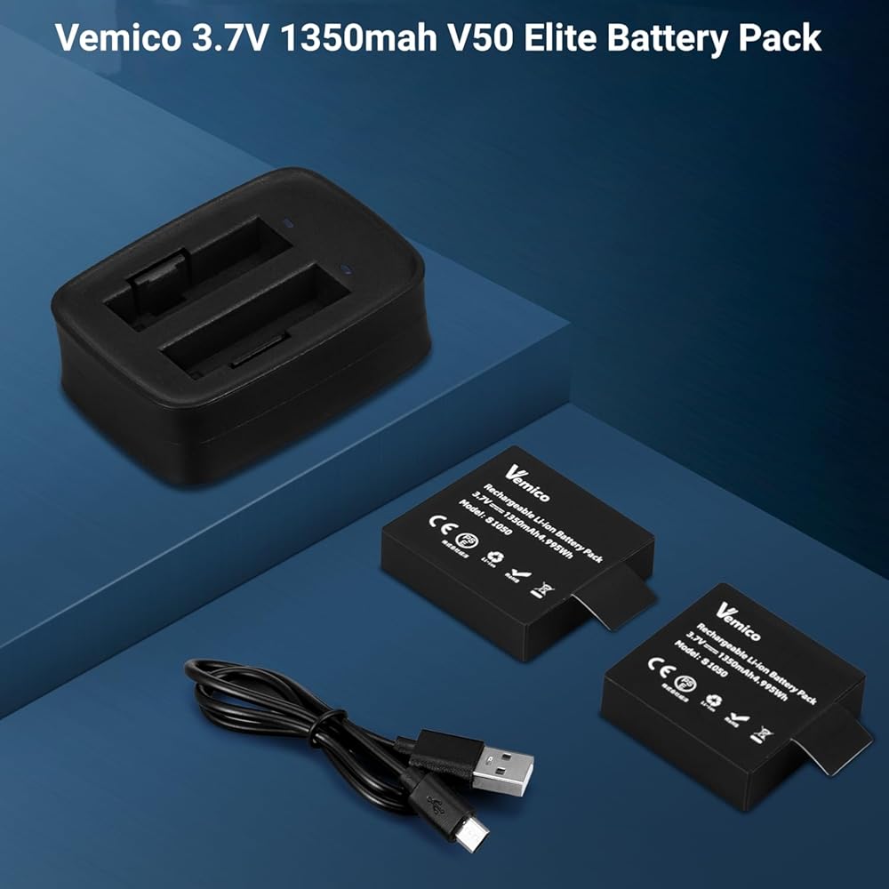 مجموعة شاحن بطارية كاميرا Vemico Action V50 Elite بطارية 1350 مللي أمبير في الساعة 2 حزمة مع شاحن USB مزدوج لـ AKASO V50 Elite، Rollei 530/630، Goxtreme Blackhawk+، ThiEYE T5/T5e/T5 pro/E7، Andoer AN7000
