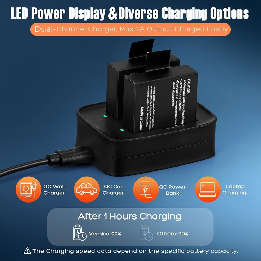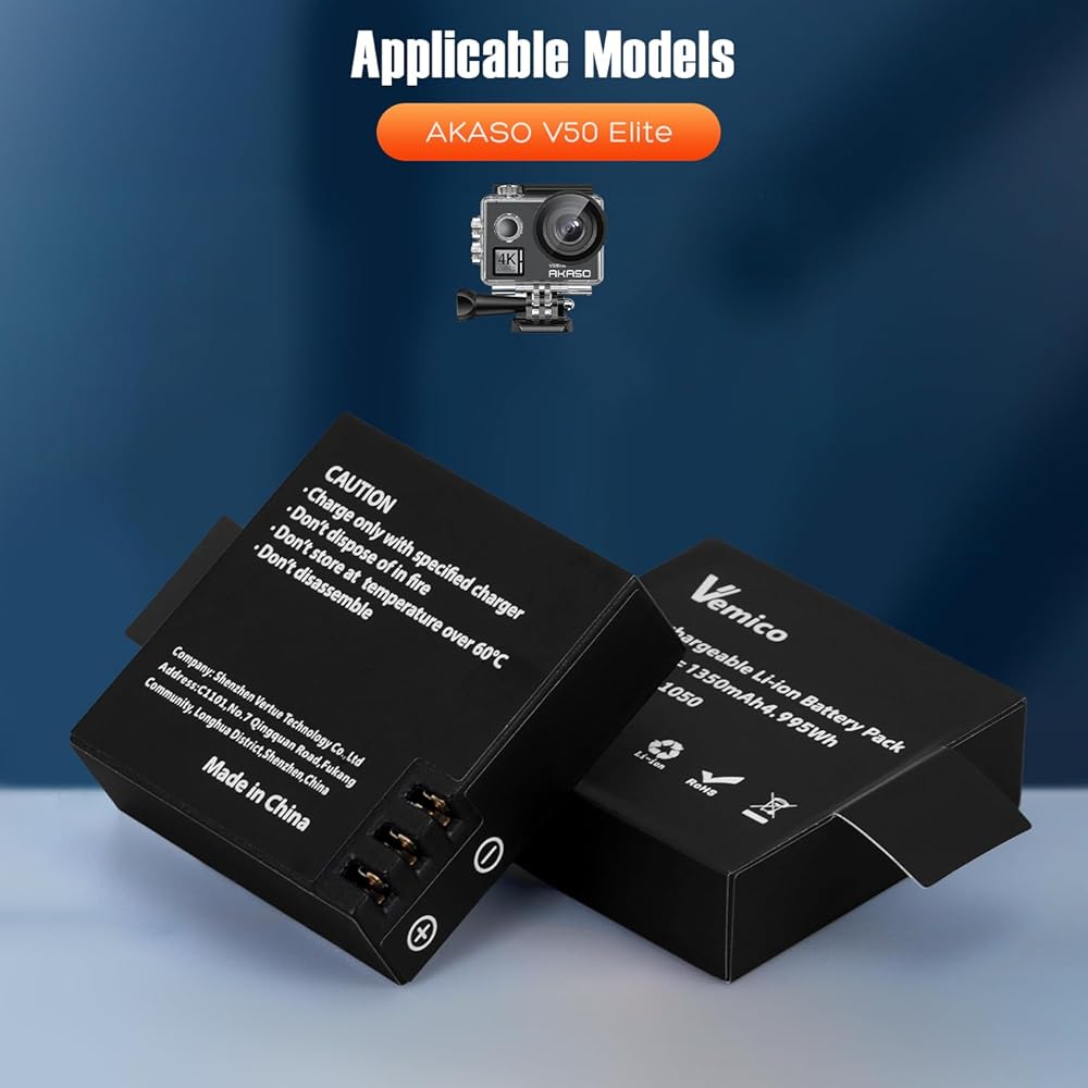 • توافق مثالي: بطارية كاميرا الحركة Vemico V50 Elite متوافقة تمامًا مع AKASO V50 Elite، Rollei 530/630، Goxtreme BlackHawk+/BlackHawk/Stage، ThiEYE T5/T5e/T5 Edge/T5 pro/E7، TecTecTec XPRO4+، Andoer AN7000. لا يتناسب مع كاميرا AKASO V50X/ V50 Pro Action.