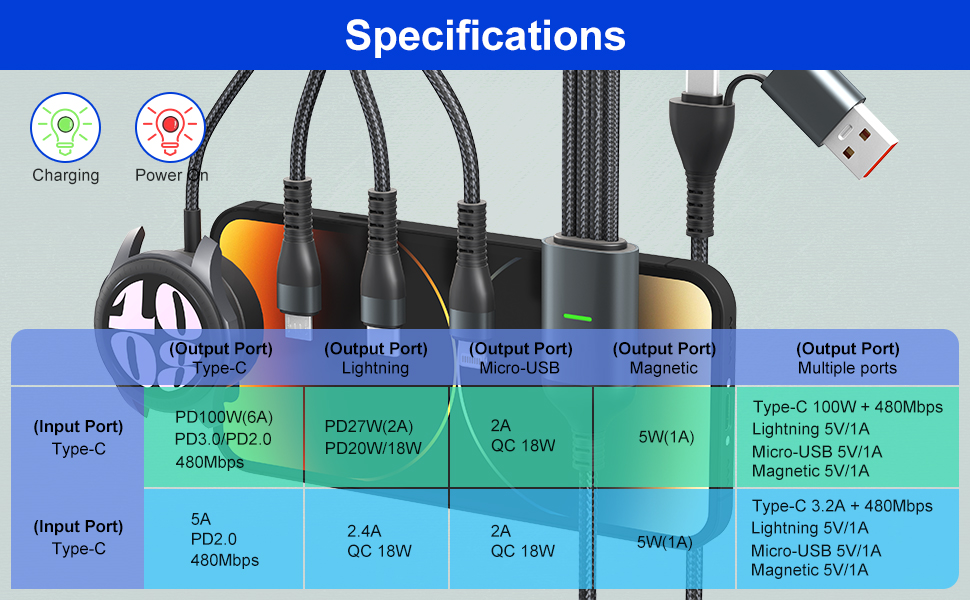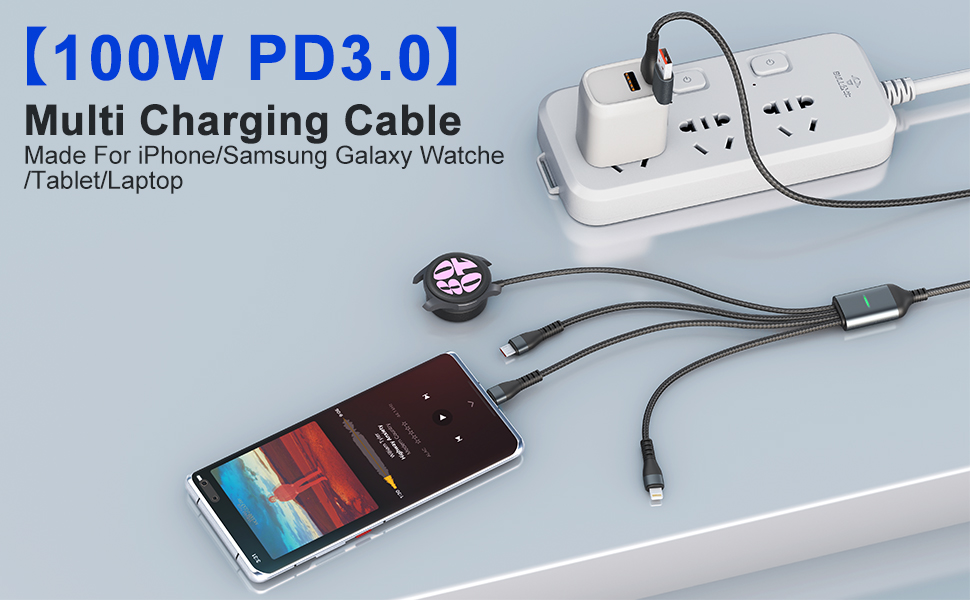 【تصميم شحن 4 في 2】 شاحن Galaxy المغناطيسي السريع (5A) + USB C (100 واط) + Lightning (27 واط) + Micro-USB (18 واط) إلى كابل USB-C/USB-A (3 متر)، 4 في 2 Galaxy Watch يتميز كابل الشاحن بتصميم ذو 4 وظائف، ومتوافق مع كل من شواحن USB A وUSB C، يمكن لكابل واحد أن يلبي 8 أنواع (4X2) من احتياجات الشحن.