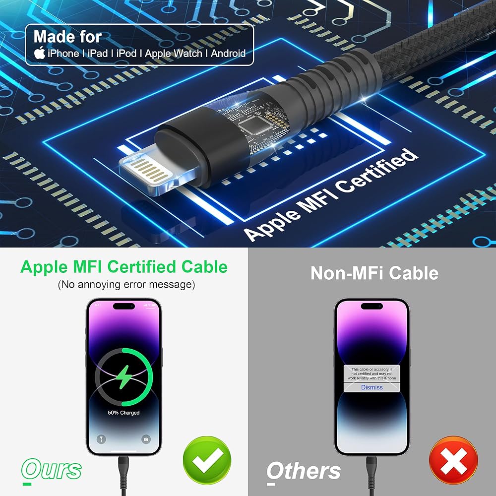 【معتمد من Apple MFi + تصميم ترقية】يحتوي كابل USB A/C إلى Lightning على شريحة معتمدة، ويوفر توافقًا بنسبة 100% للشحن السريع دون رسالة خطأ. جديلة من النايلون ومادة سبائك الألومنيوم، تم اختبار الموصل أكثر من 15000 مرة. هيكل من سبائك الألومنيوم، وسلك نحاسي عالي النقاء ونوى نحاسية سميكة، ودرع ثلاثي يضمن أداء شحن سريع يدوم طويلاً.