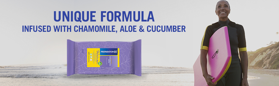 • Medicated wipes formulated with cucumber, aloe, vitamin E, shea butter and chamomile for a soothing yet refreshing effect