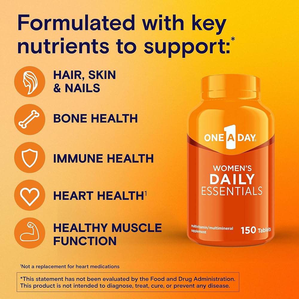 A COMPLETE MULTIVITAMIN: One A Day Daily Essentials Multivitamin for Women is formulated with key nutrients to support:* hair, skin and nails, bone health, immune health, heart health(1), and healthy muscle function