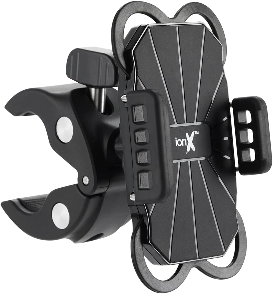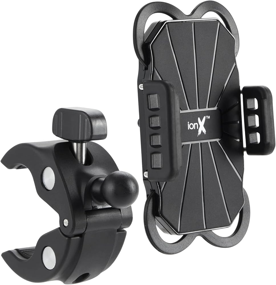 Keep your phone visible and usable while mountain biking, exercising, and riding around town using this bike cell phone holder handlebar mount. It can be securely mounted to any round handlebar or other round pole between 0.7-1.25 inches (18-32 mm) in diameter, making it suitable for almost any bicycle, motorcycle, or ATV, or a vertical support bar on a UTV, golf cart, or other vehicle. It is compatible with iPhone Series 14, 13, 12, 11, SE (2nd gen), XS Max, XS, XR, X, as well as all Samsung Galaxy phones, including S22, S21, S20, S10, and other phones with phone sizes from 3.5-6.8 inches and up to 3.5 inches wide, even when using a thick protective case. The ball joint allows you to freely rotate your phone up to 360 degrees for landscape and portrait orientation, and to adjust the vertical and horizontal angles for the optimal viewing angle. Mount this bike phone holder to your bicycle or motorcycle handlebars for ready access to the GPS mapping system, mount it to your shopping cart for easy access to your shopping list at the grocery store, or mount it to your child's stroller handle to listen to your favorite podcasts on your afternoon walk. This phone holder is sure to become your next favorite item in your bike accessories collection. ionX is a trademark or registered trademark of Juvo Plus, Inc. All other marks shown are owned by their respective owners.