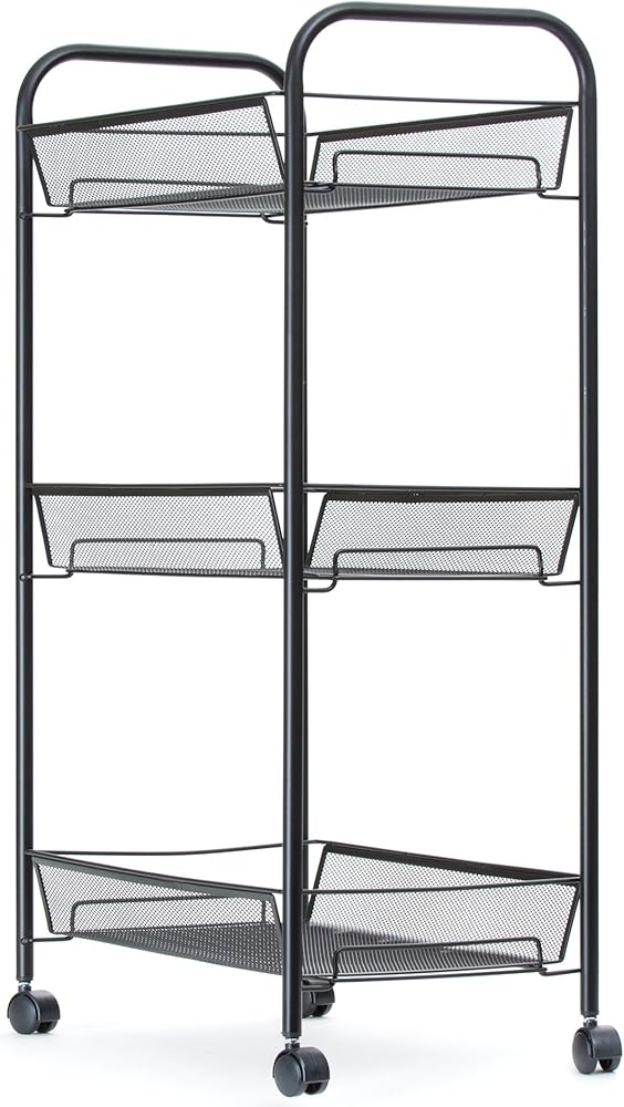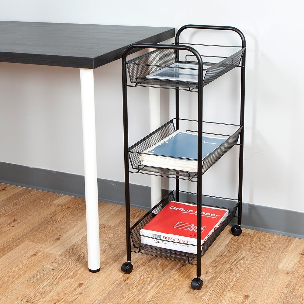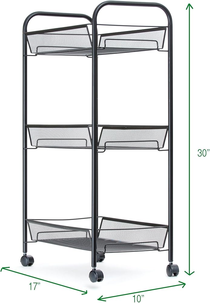 Elevate your storage solutions with this uniquely styled rolling supply cart. Designed to hold substantial supplies without allowing them to spill or fall over the sides, the deep mesh baskets on each level provide ample storage space while allowing you to still view the contents on each level clearly. Say goodbye to tacky plastic storage units, and replace them with a rolling cart that's built to last. The unobtrusive design blends in seamlessly at home, at the office, or even in the classroom.