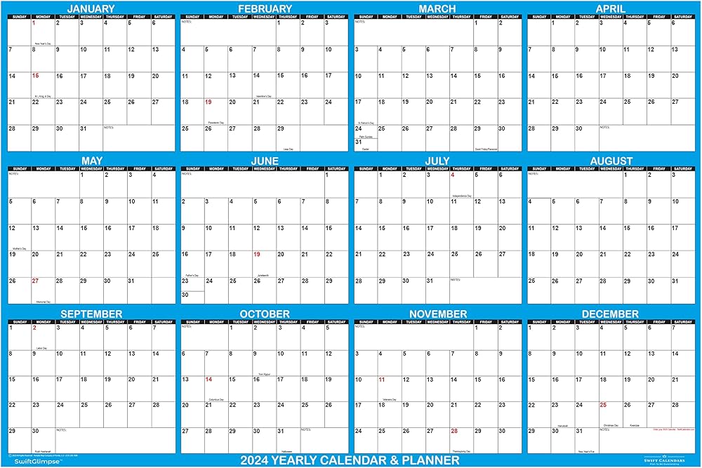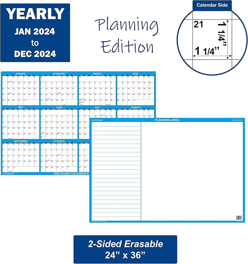 تقويم قابل للمسح لعام 2024، مخطط حائط قابل للمسح الجاف من SwiftGlimpse، 91.44 سم × 60.96 سم، كبير، أفقي، قابل للعكس لمساحة تخطيط كبيرة