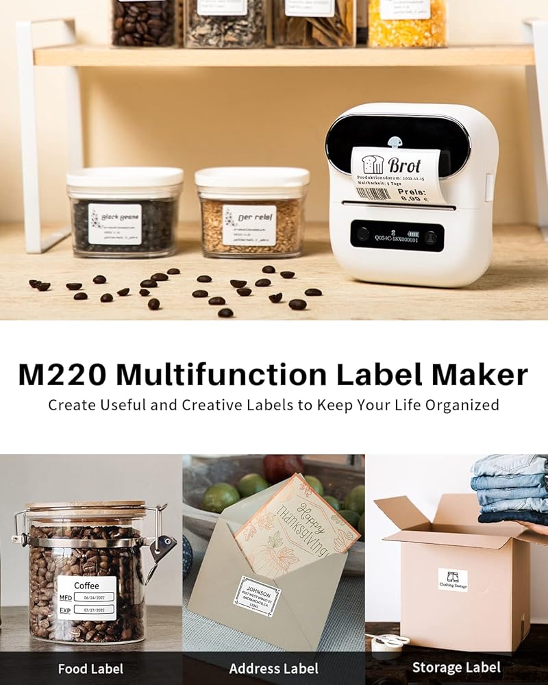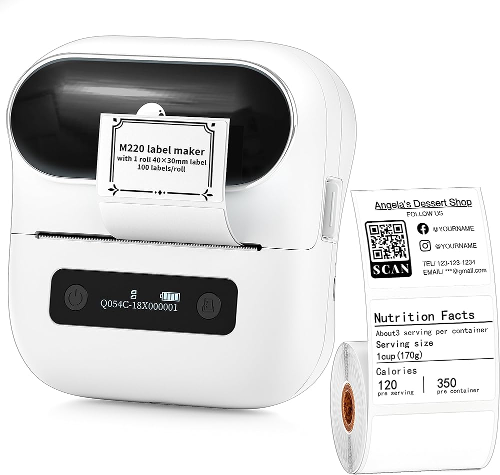 طابعة ملصقات حرارية من Itari Label Maker، طابعة M220 بلوتوث لاسلكية محمولة بدون حبر للرمز الشريطي، والعناوين، ووضع العلامات، والبريد، والأعمال التجارية الصغيرة، وهواتف الدعم والكمبيوتر الشخصي، مع ملصق واحد مقاس 40 × 30 مم