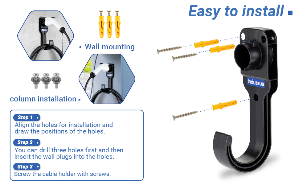 【سعة أكبر لالتقاط الكابلات】: على عكس دعامات شحن EV الشائعة الأخرى، تتميز شركة INDUZEUG الفريدة بخطاف كابل أطول وأوسع، والذي يمكن أن يستوعب بسهولة مجموعات أطول وأكثر من كابلات الشحن.